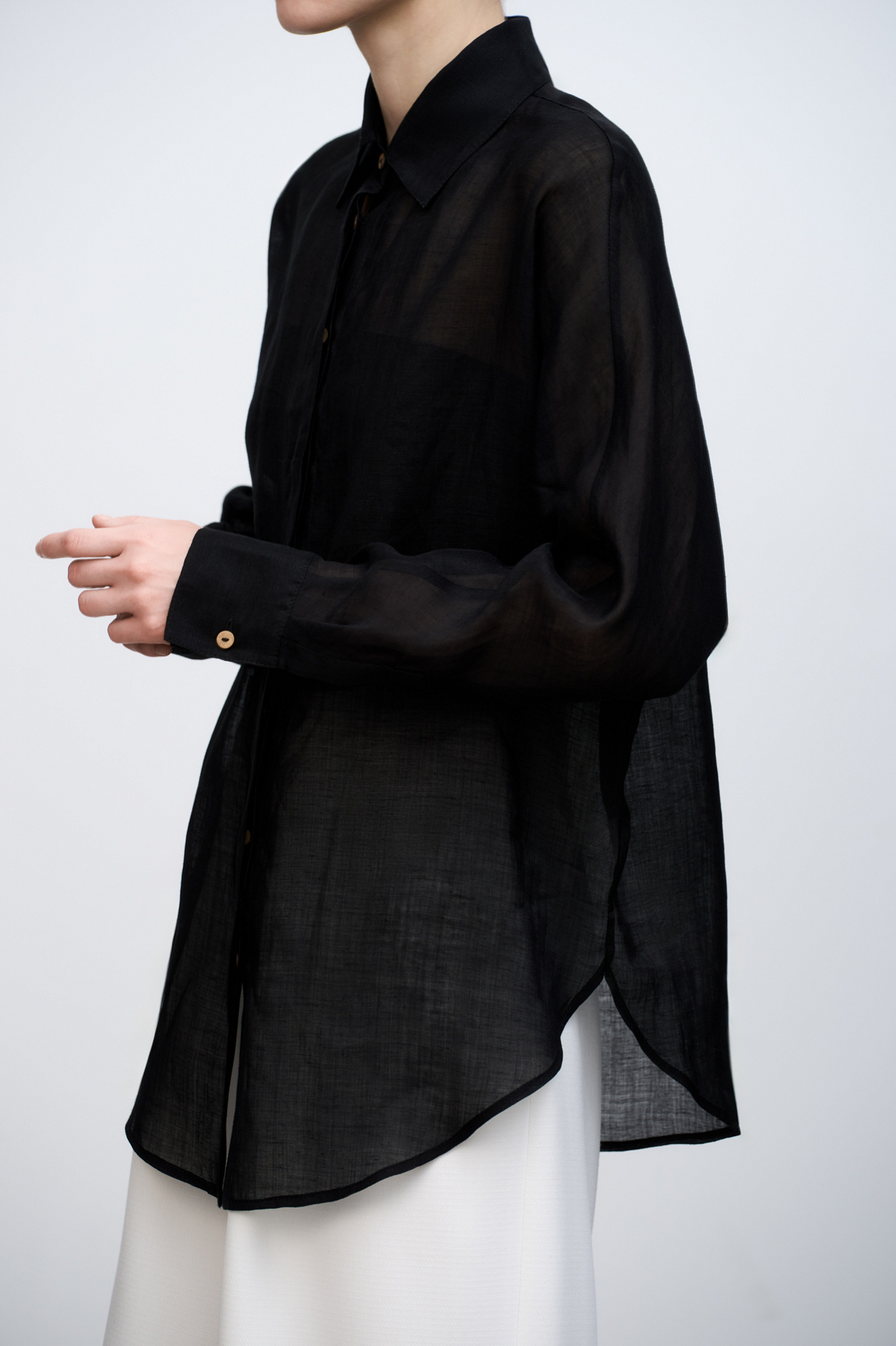 Полупрозрачная рубашка из 100% крапивы. Модель свободного силуэта с классическим воротом и манжетами. Застежка на пуговицы. Ткань из крапивы очень легкая, не электризуется, а натуральное происхождение подчеркивает экологичность данной модели.