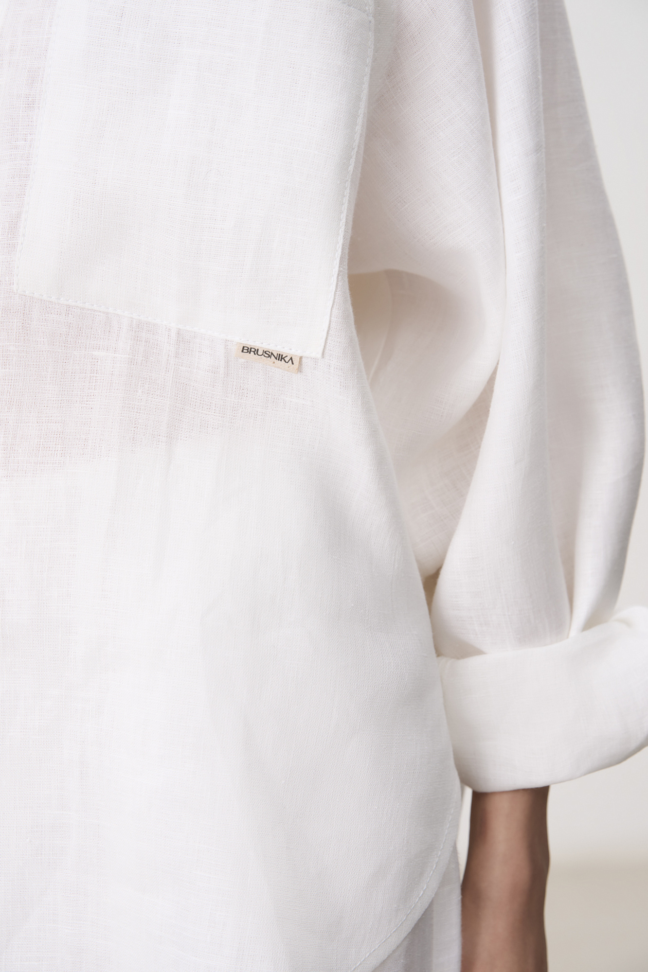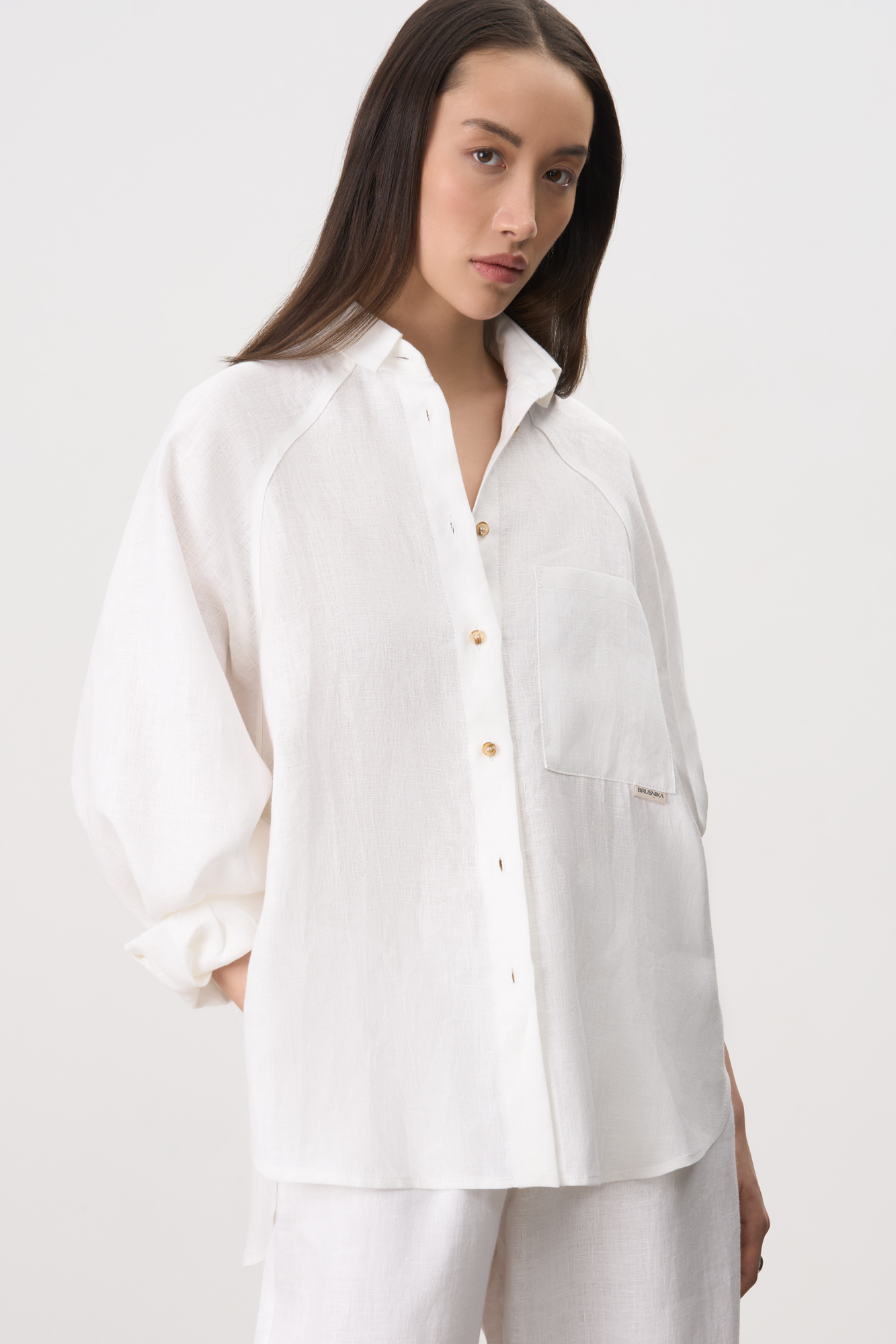 Рубашка из 100% льна с рукавом реглан. Модель свободного кроя, с длинными рукавами с короткими манжетами, классическим отложным воротником и нагрудным карманом с брендированным ярлыком. Застежка на пуговицы.