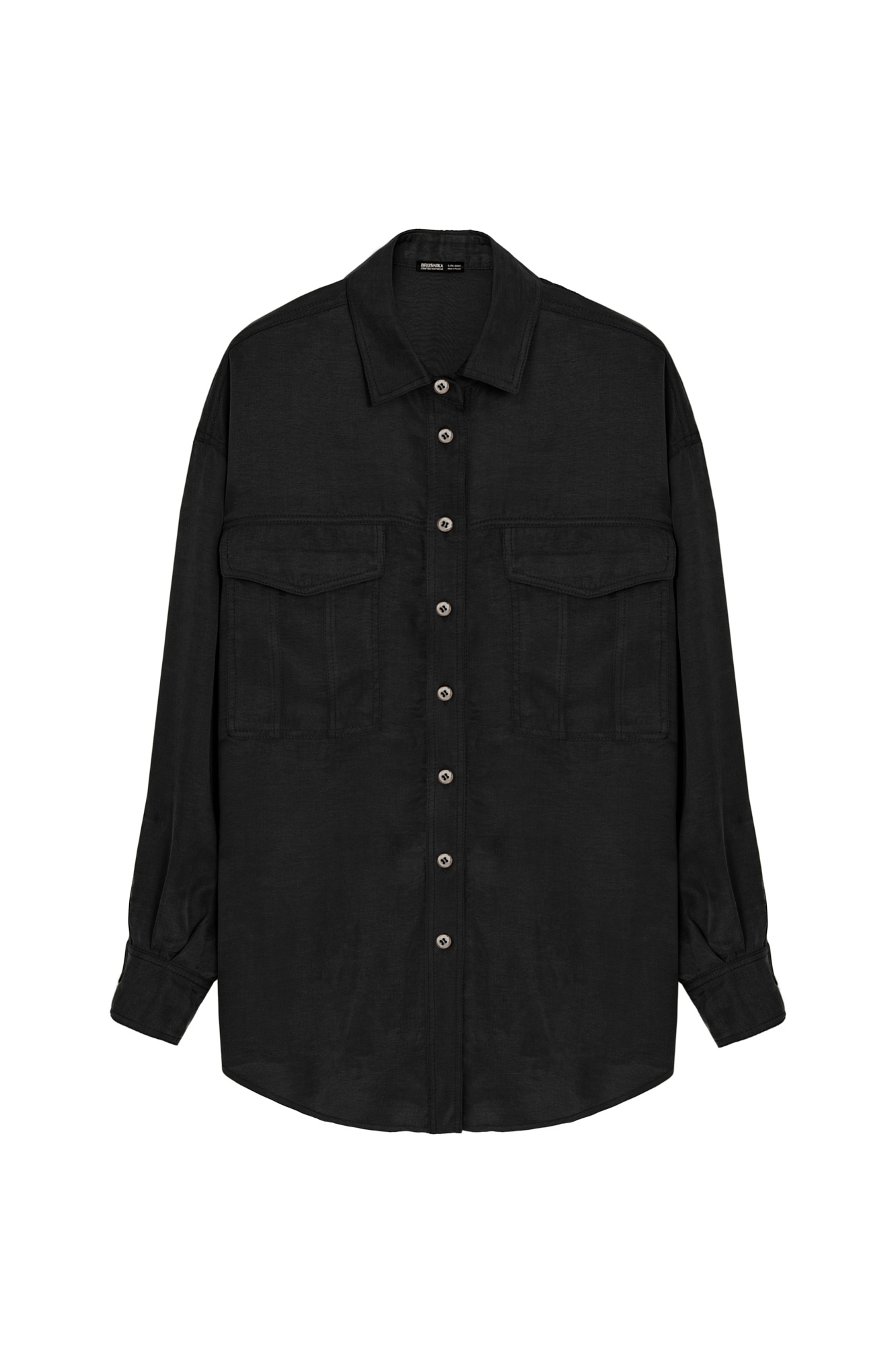 Классическая рубашка из 100% купры с накладными карманами на груди, спущенным рукавом и неровным низом. Дополнить образ можно брюками из такого же материала.