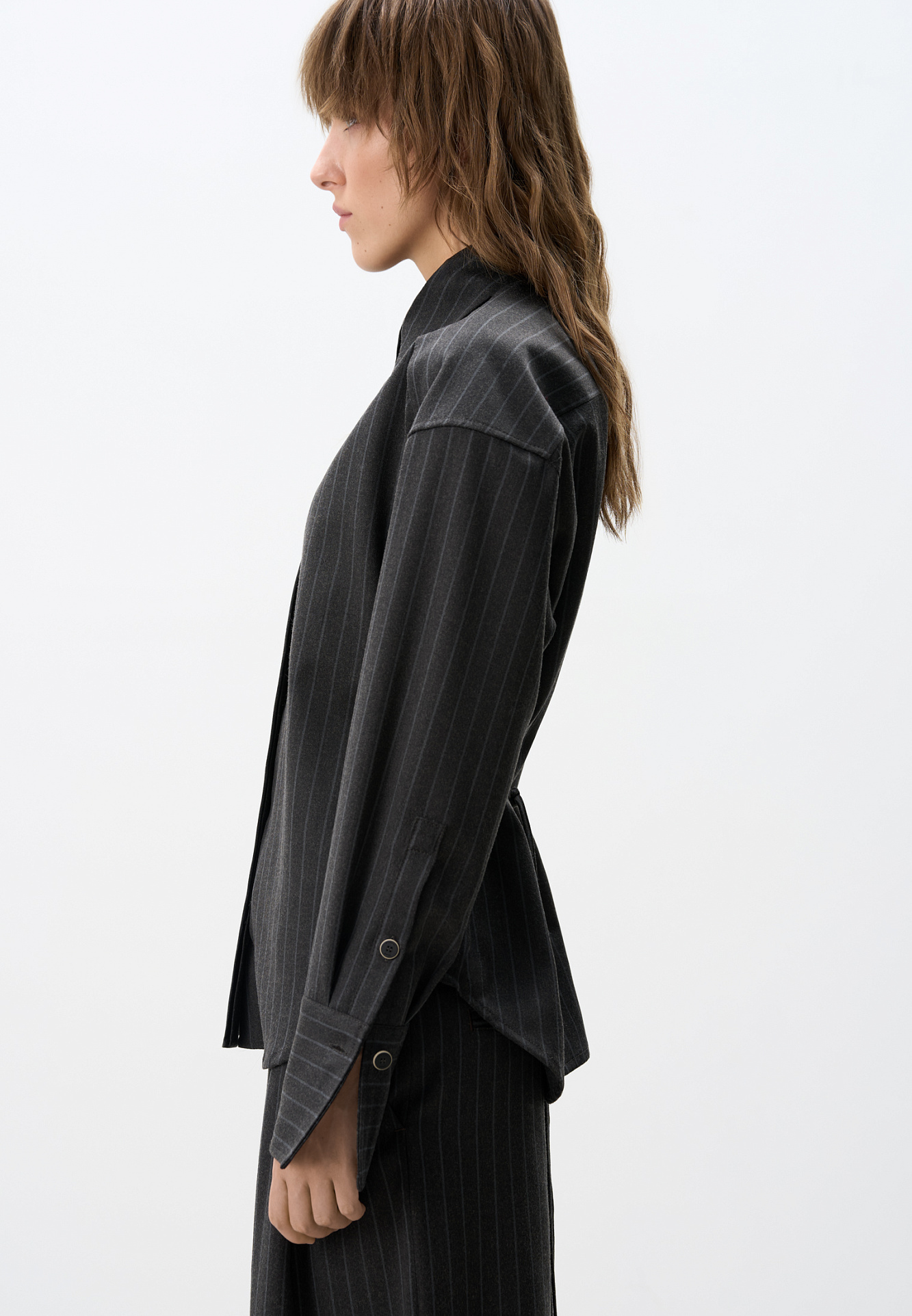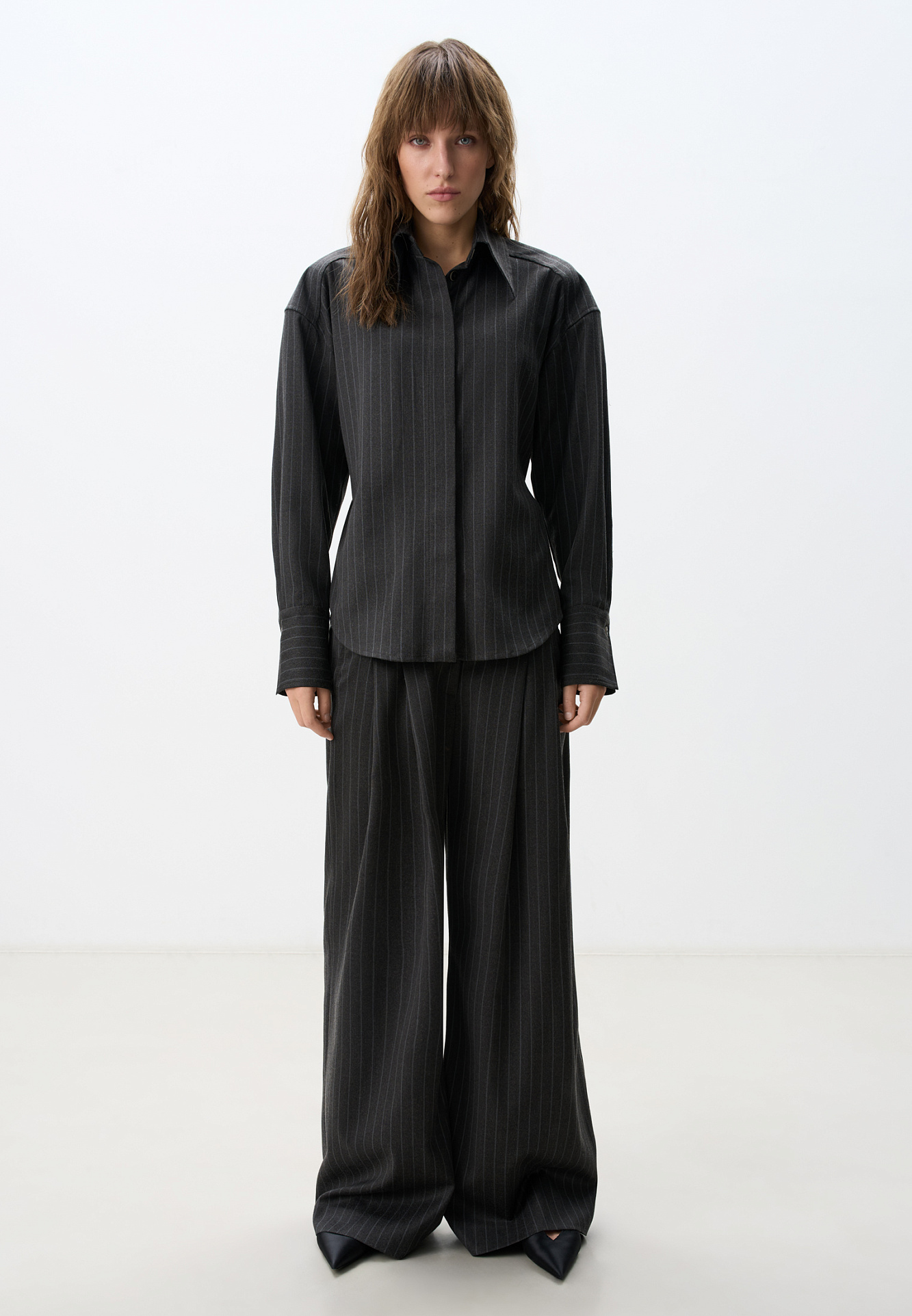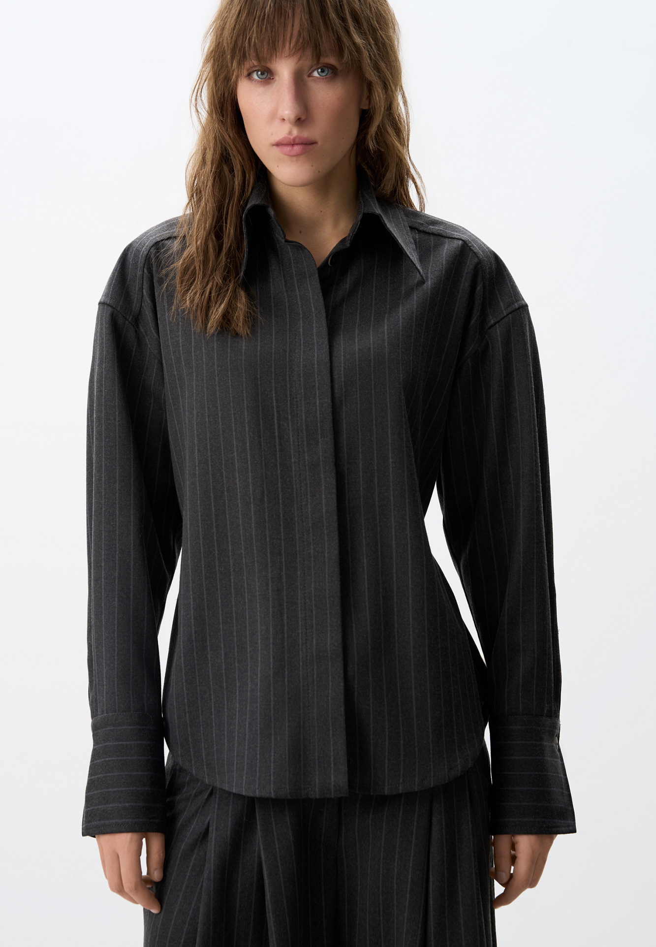 Рубашка из шерсти в полоску. Модель прямого кроя, с длинными рукавами, расклешенными манжетами, классическим отложным воротником и увеличенными плечами. Застежка на пуговицы под планкой.