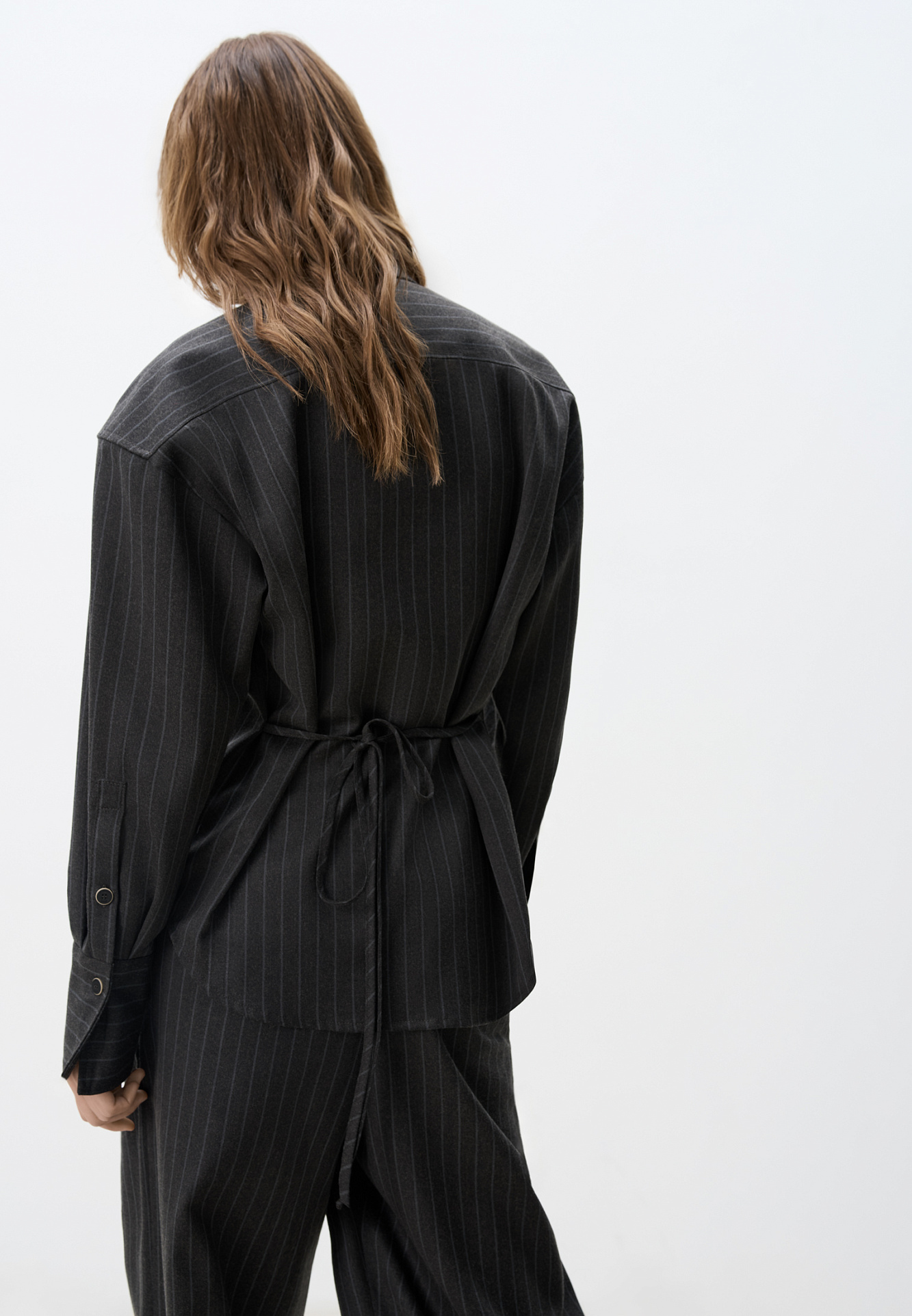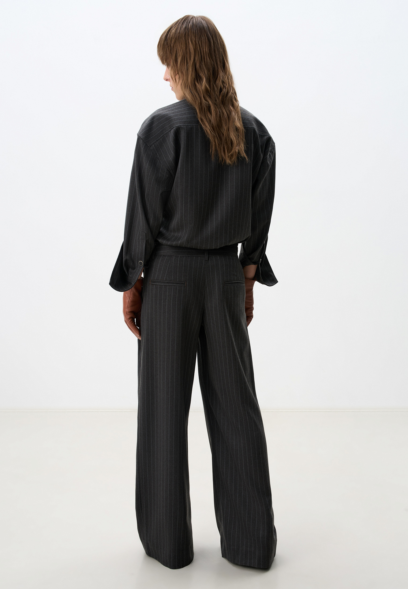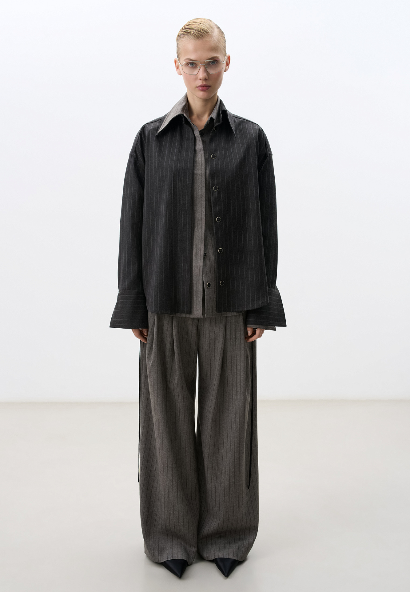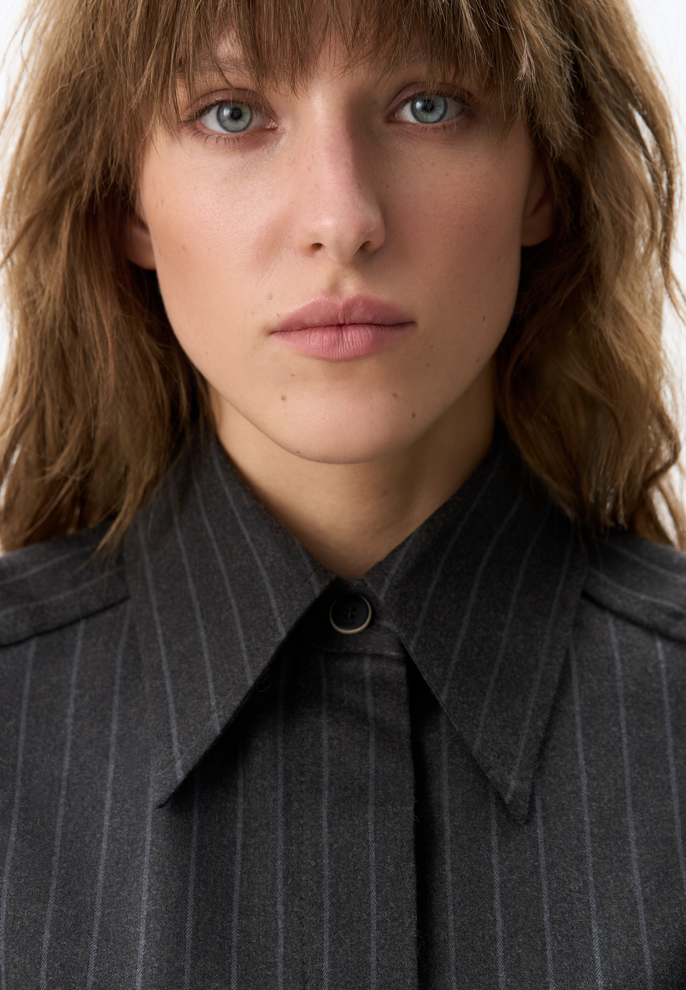 Рубашка из шерсти в полоску. Модель прямого кроя, с длинными рукавами, расклешенными манжетами, классическим отложным воротником и увеличенными плечами. Застежка на пуговицы под планкой.