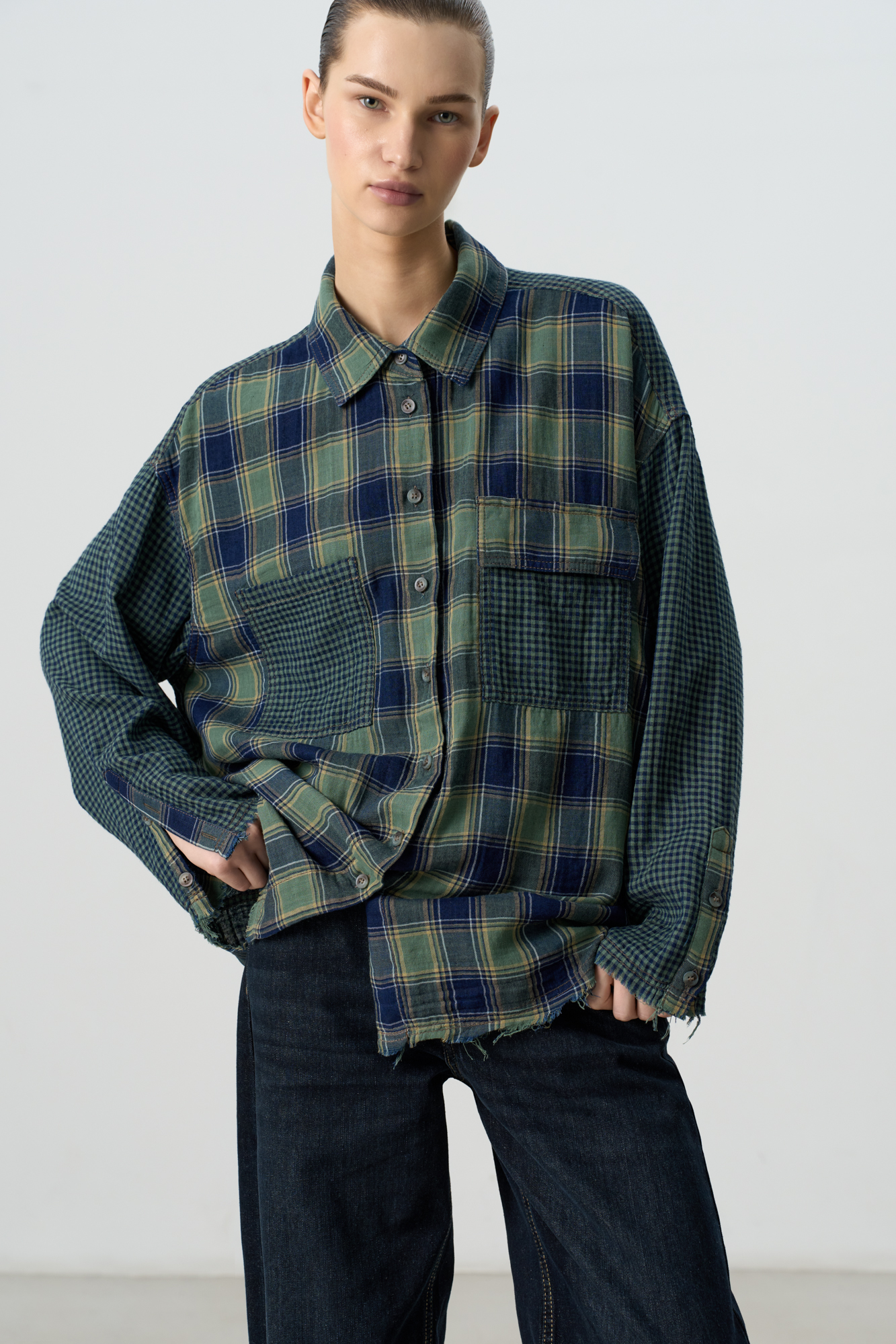 Рубашка в клетку из 100% хлопка. Модель прямого кроя, со спущенной линией плеч, длинными рукавами, классическим отложным воротником, двумя нагрудными карманами, один из них с клапаном. Манжеты и низ изделия выполнены с эффектом необработанного края. Застежка на пуговицы.