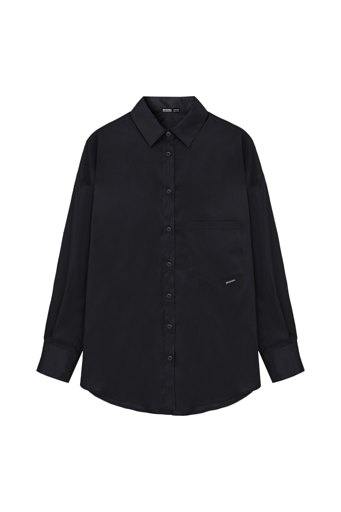 Рубашка с накладным карманом и брендированным ярлыком. Модель свободного силуэта, длинные рукава с манжетами и асимметричный нижний край.