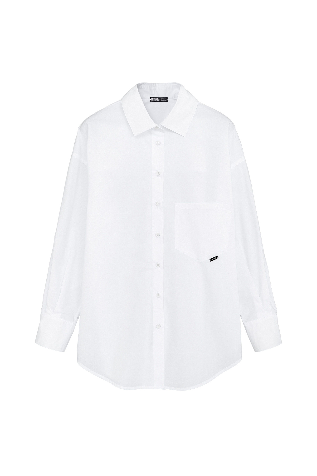 Рубашка с накладным карманом и брендированным ярлыком. Модель свободного силуэта, длинные рукава с манжетами и асимметричный нижний край.