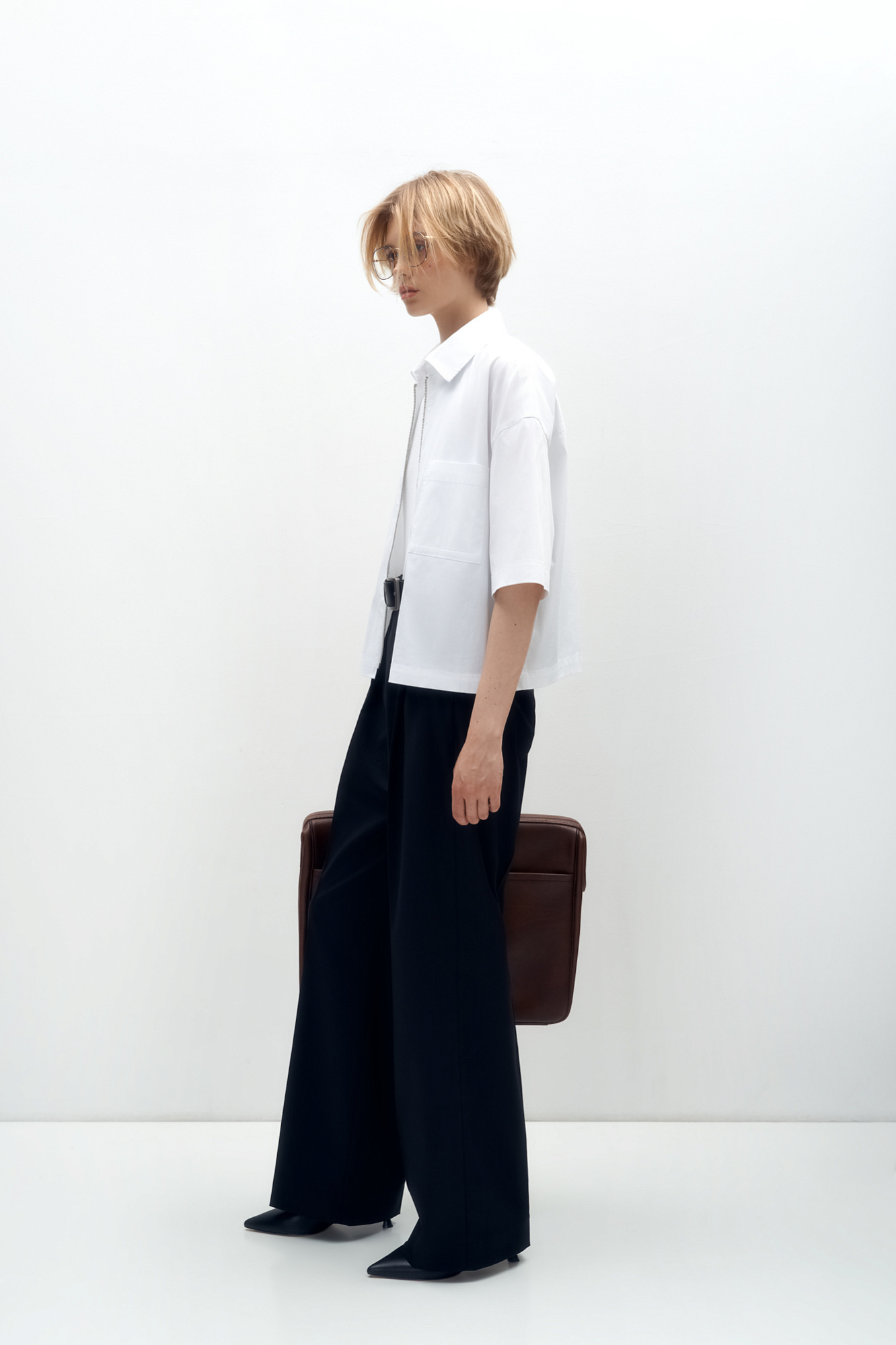 Рубашка из хлопка с добавлением полиамида. Модель прямого кроя, со спущенной линией плеч, отложным воротником, короткими рукавами, накладным карманом на груди и застежкой на молнию.