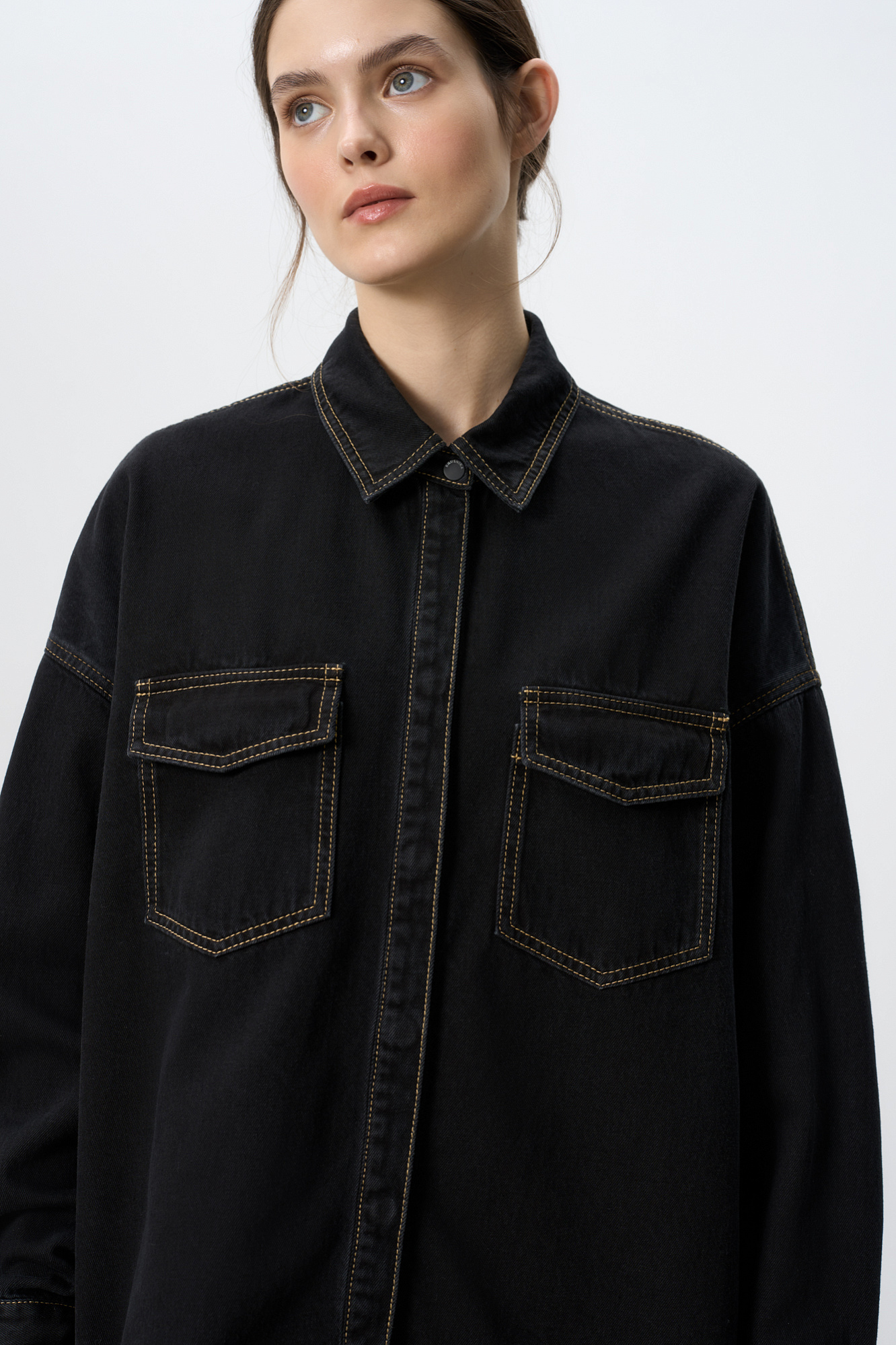 Джинсовая рубашка из 100% хлопка. Модель свободного силуэта, с длинными рукавами, отложным воротником и накладными карманами на груди с клапанами. Застежка на магнитные пуговицы. Изделие декорировано вставкой из кружева на спине.