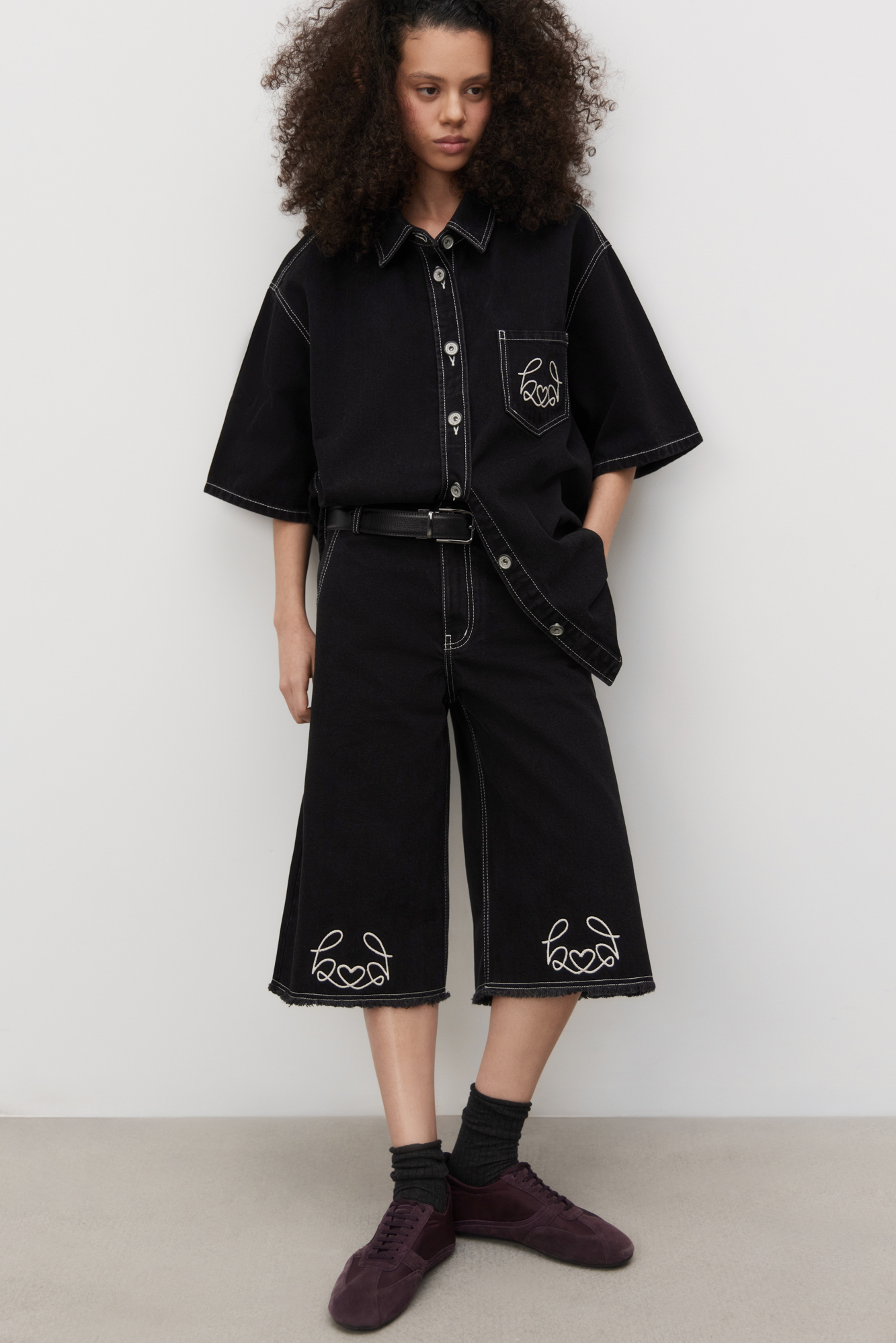 Джинсовая рубашка из 100% хлопка. Модель свободного кроя с классическим отложным воротником и коротким рукавом. Рубашка дополнена нагрудным карманом, украшенным вышивкой в виде сердца. Застежка на пуговицы.