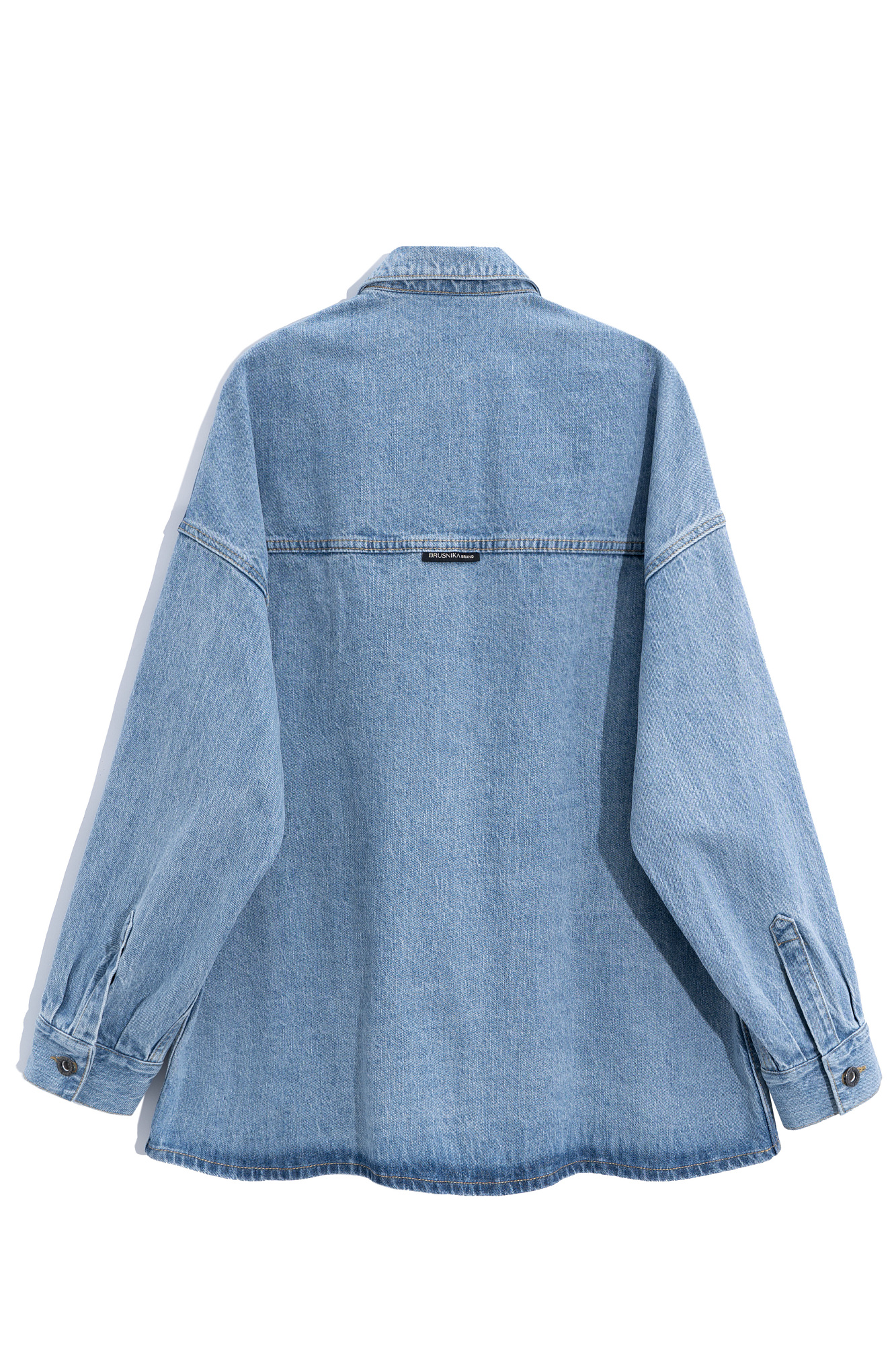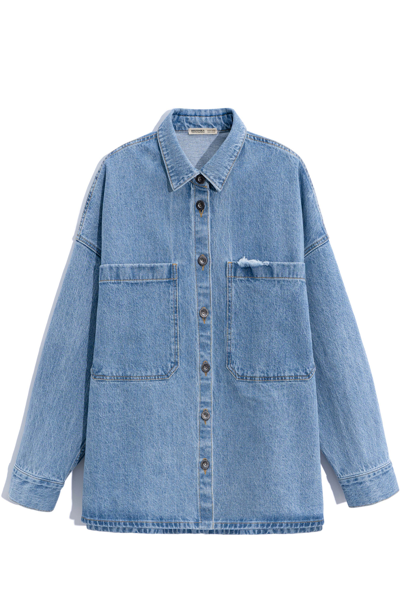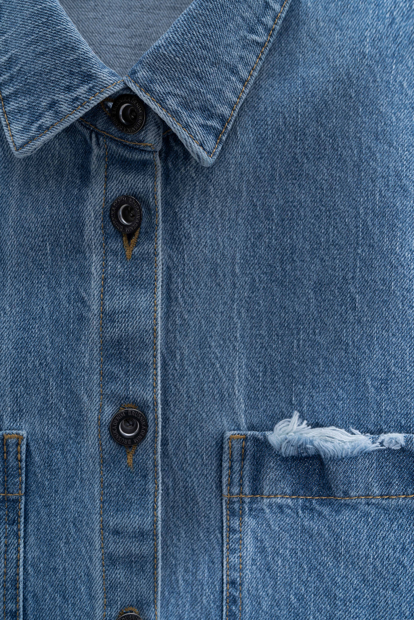 Джинсовая рубашка из 100% хлопка. Модель прямого силуэта с классическим отложным воротником, длинными рукавами и двумя большими нагрудными карманами. Застежка на металлические пуговицы.
