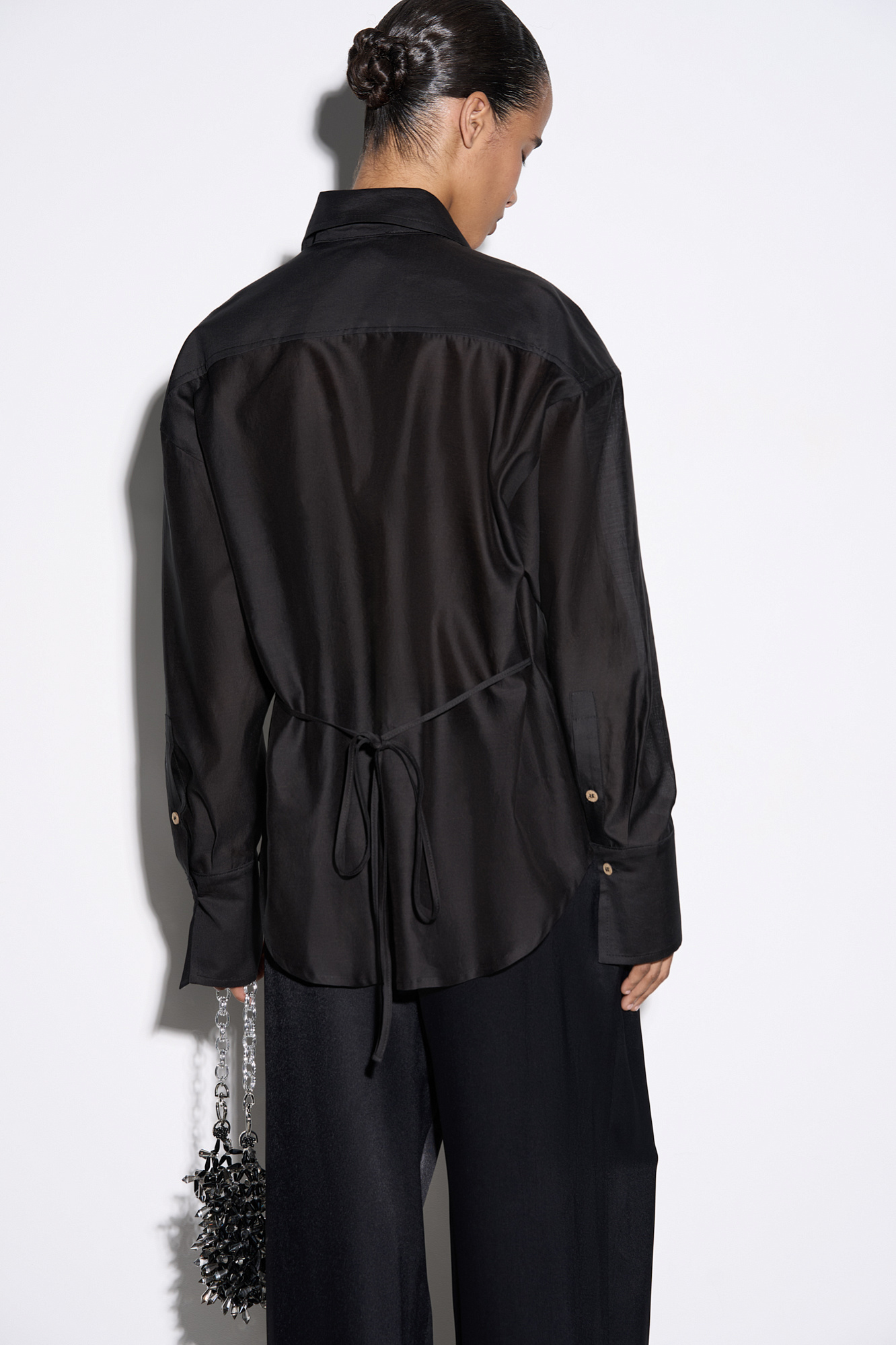 Рубашка из шелка с добавлением хлопка. Модель прямого кроя с длинными рукавами с манжетами, классическим отложным воротником, увеличенными плечами и завязкой на спинке. Застежка на пуговицы под планкой.