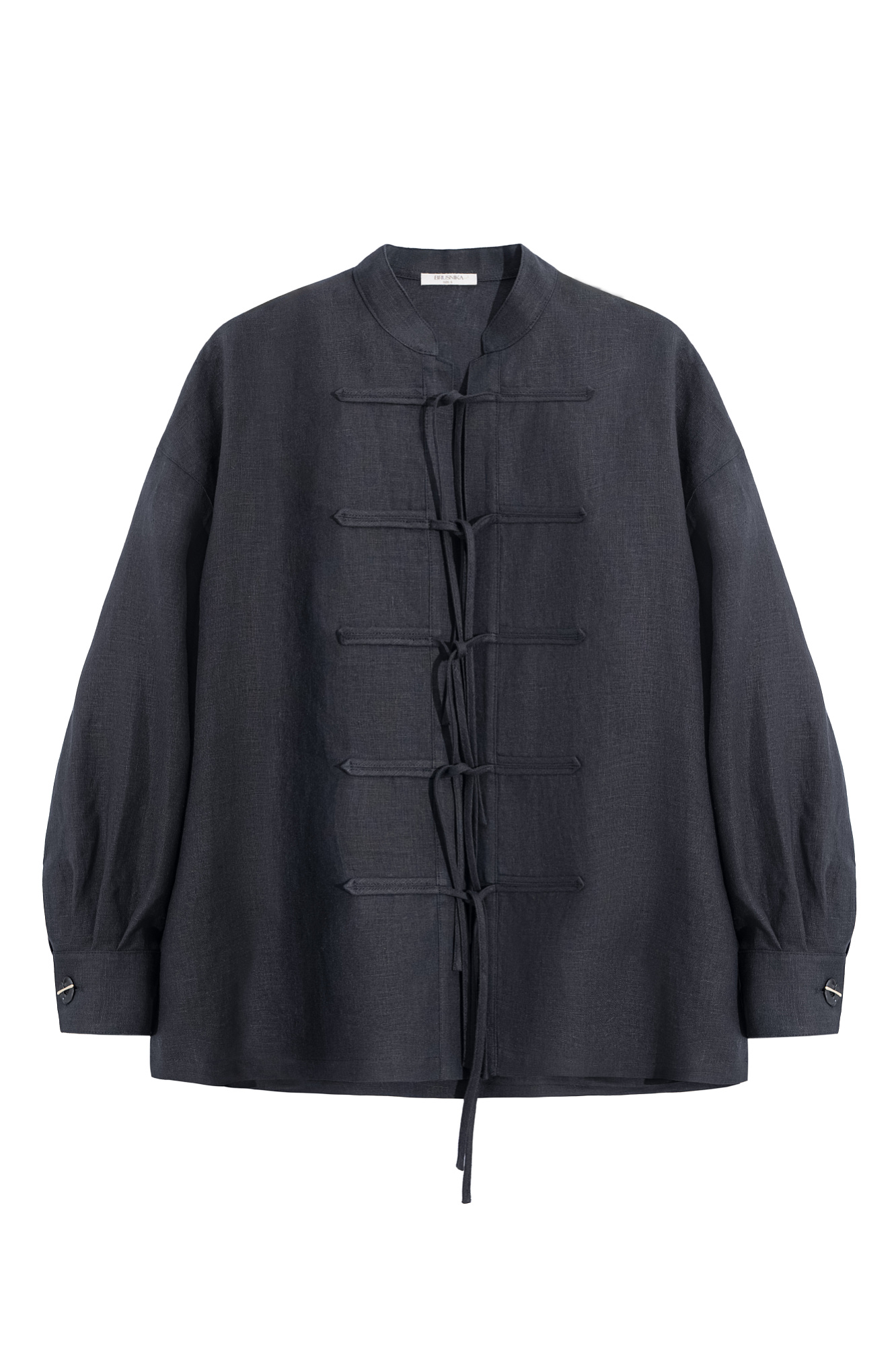 Рубашка из 100% льна на завязках. Модель свободного силуэта с воротником-стойкой, длинными рукавами с манжетами на пуговицах и спущенной линией плеча.