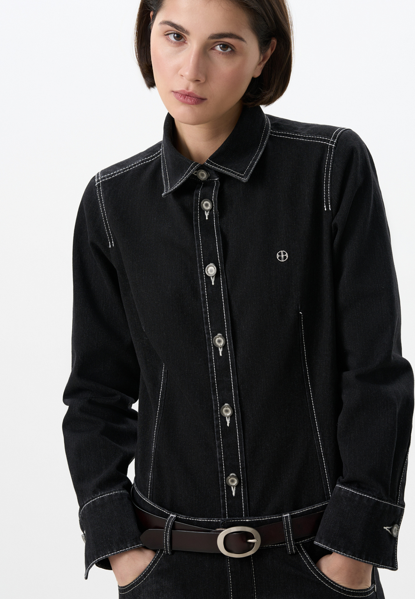 Джинсовая рубашка из 100% хлопка. Модель приталенного силуэта с классическим отложным воротником и длинными рукавами с манжетами на пуговицах. Застежка на пуговицы. Изделие декорировано вышитым логотипом бренда на груди.