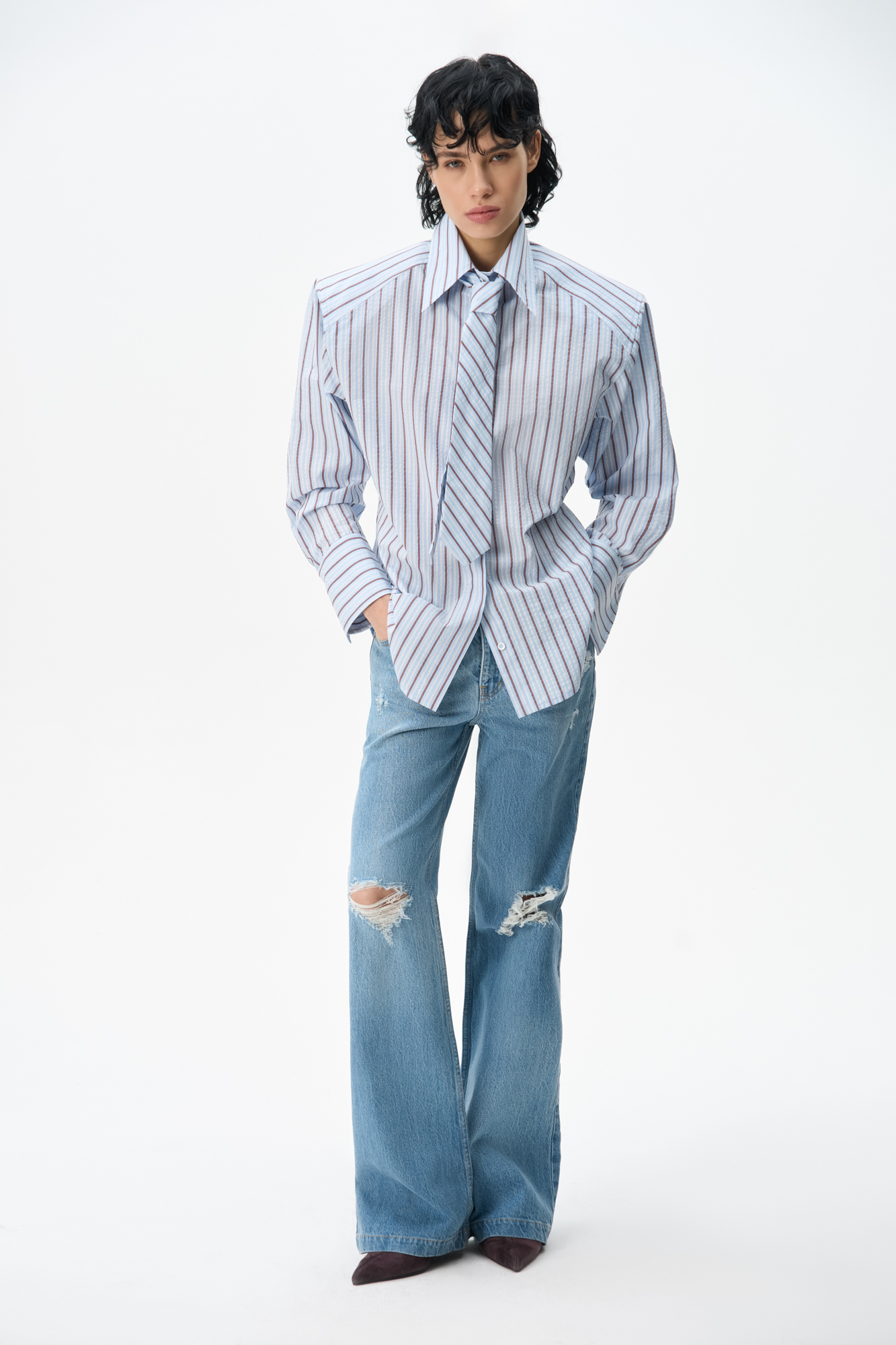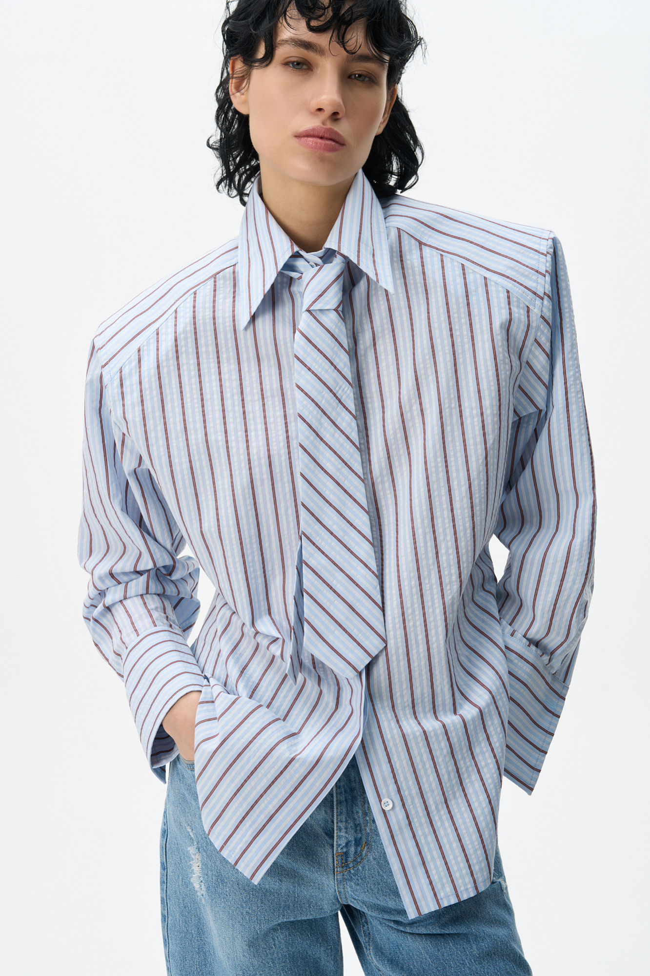 Рубашка из 100% хлопка с галстуком. Модель прямого кроя с длинными рукавами с манжетами, классическим отложным воротником, подплечниками и завязкой на спинке. Застежка на пуговицы под планкой.