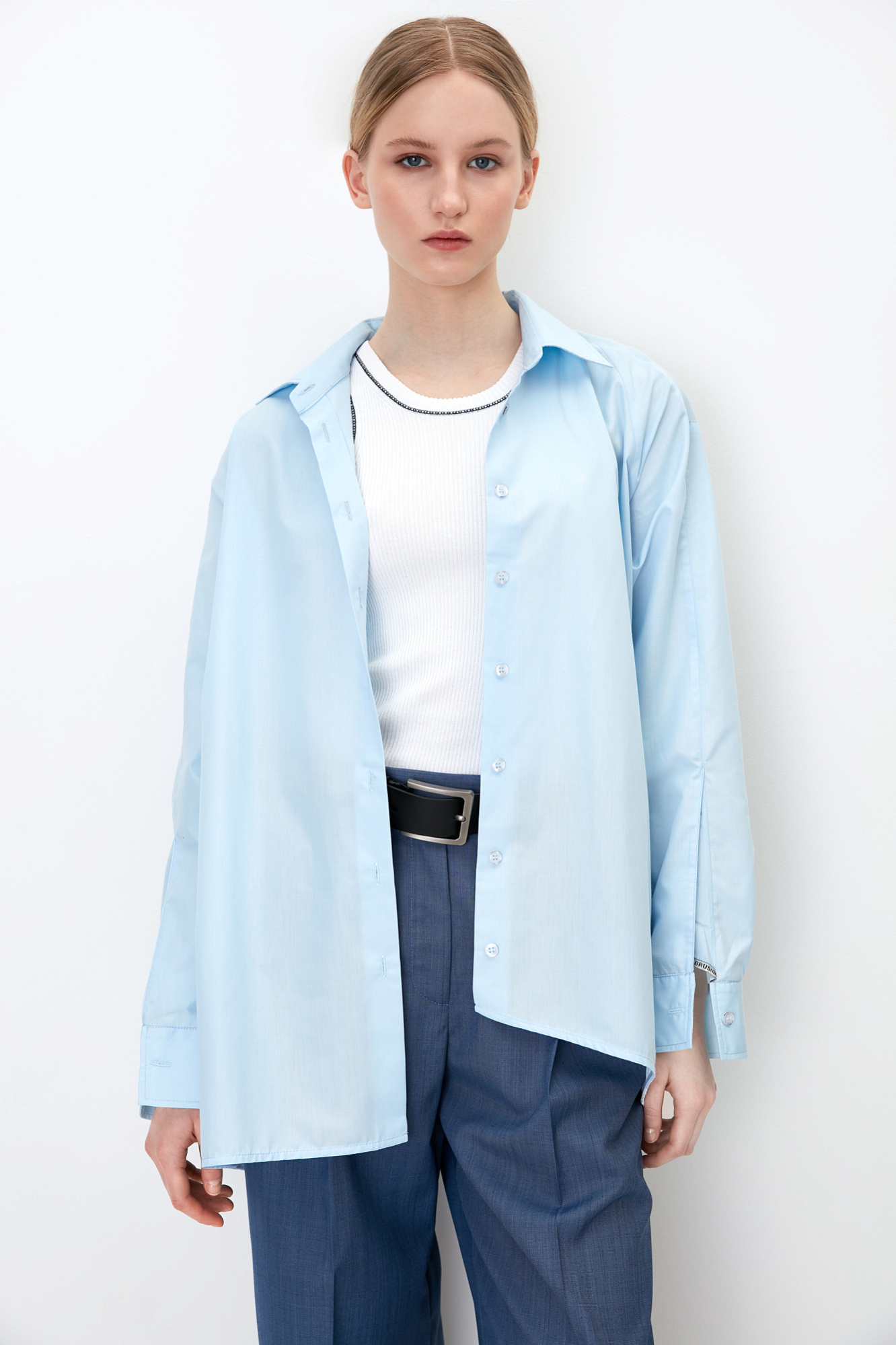 Рубашка на пуговицах с расклешенными рукавами, регулируемым манжетом и асимметричным краем.
