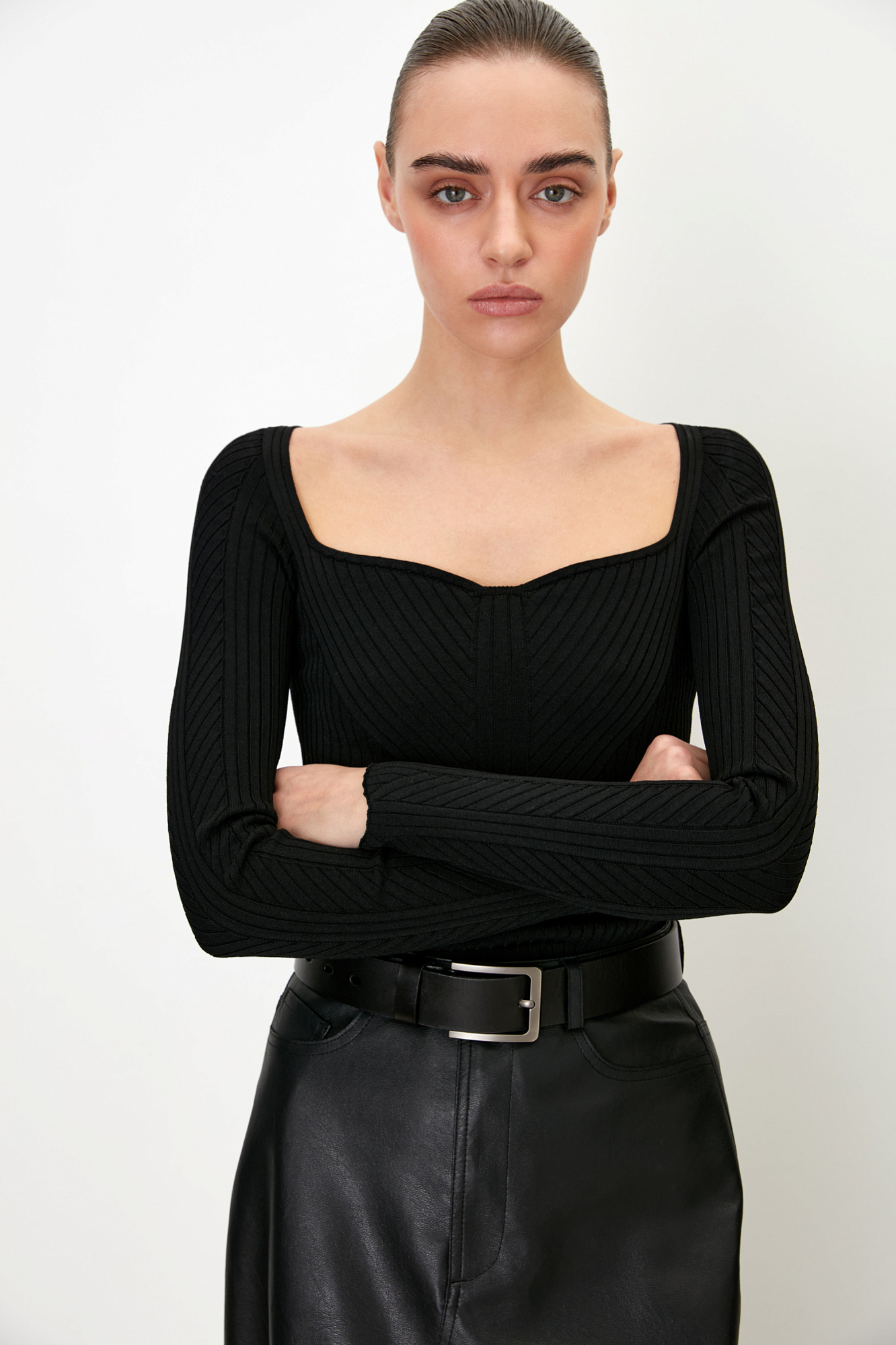 Трикотажное боди из вискозы. Модель с длинным рукавом и фигурным вырезом горловины. Изделие выполнено в широкий диагональный рубчик.