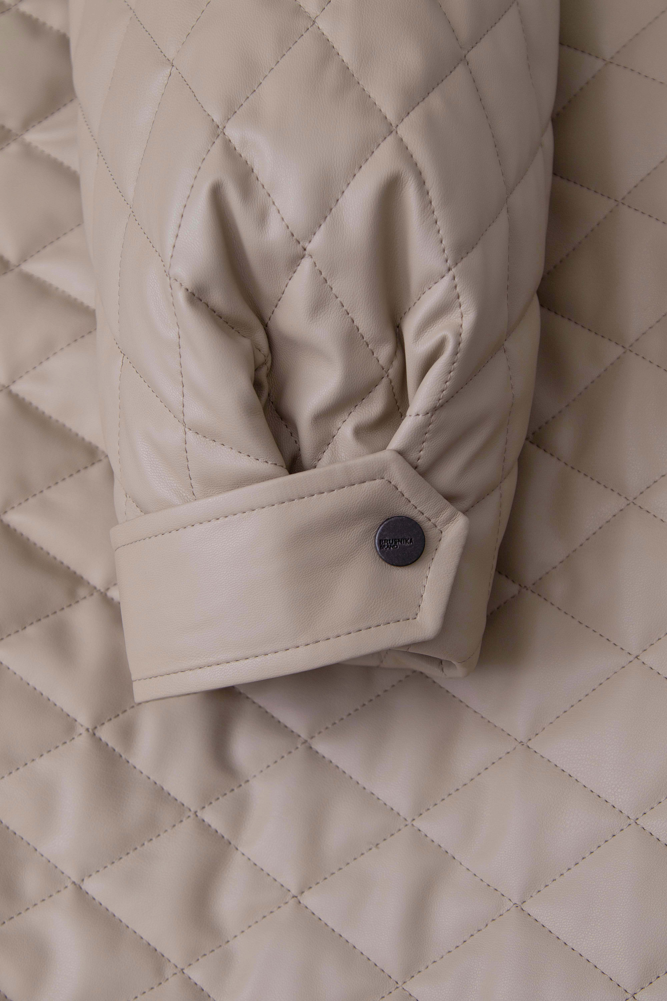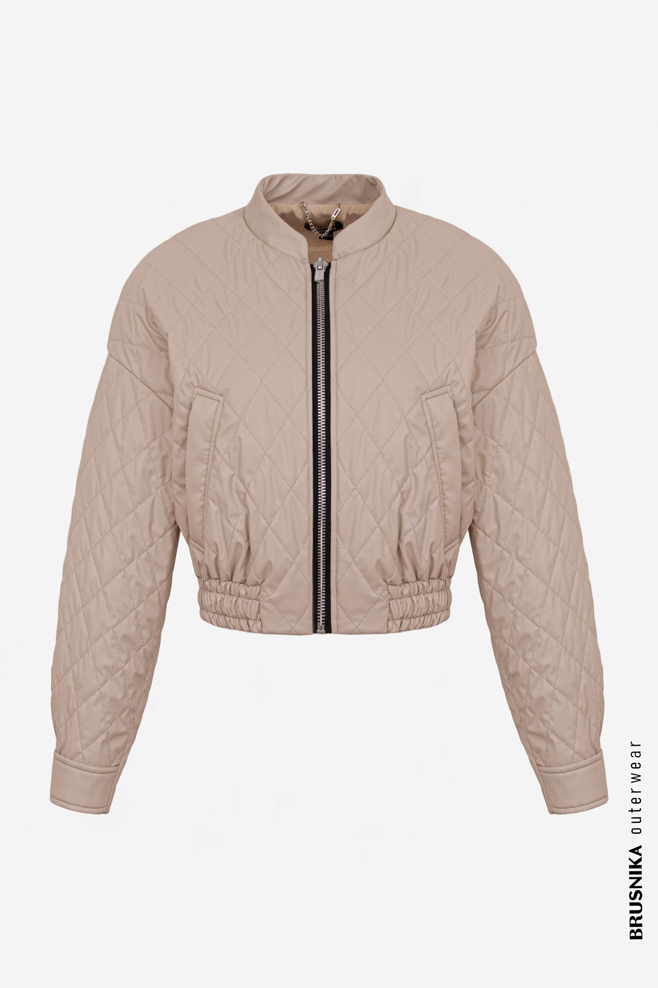 Укороченный стеганый бомбер из экокожи с воротником стойкой. Длинные рукава с манжетами на кнопках. Передние боковые карманы. Эластичный широкий пояс на резинке. Застегивается на металлическую молнию.