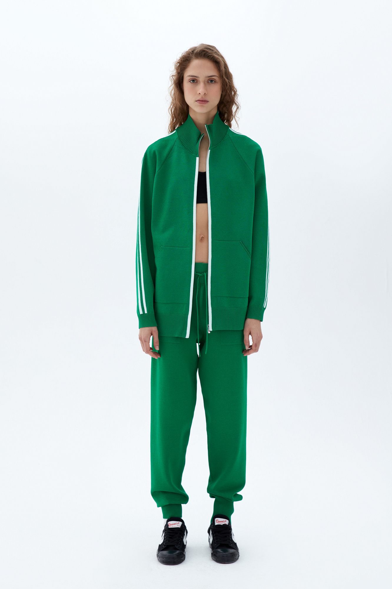 Трикотажыне спортивные брюки. Модель прямого кроя с высокими эластичными манжетами, выполненными в рубчик, регулируемым поясом на кулиске и боковыми карманами.