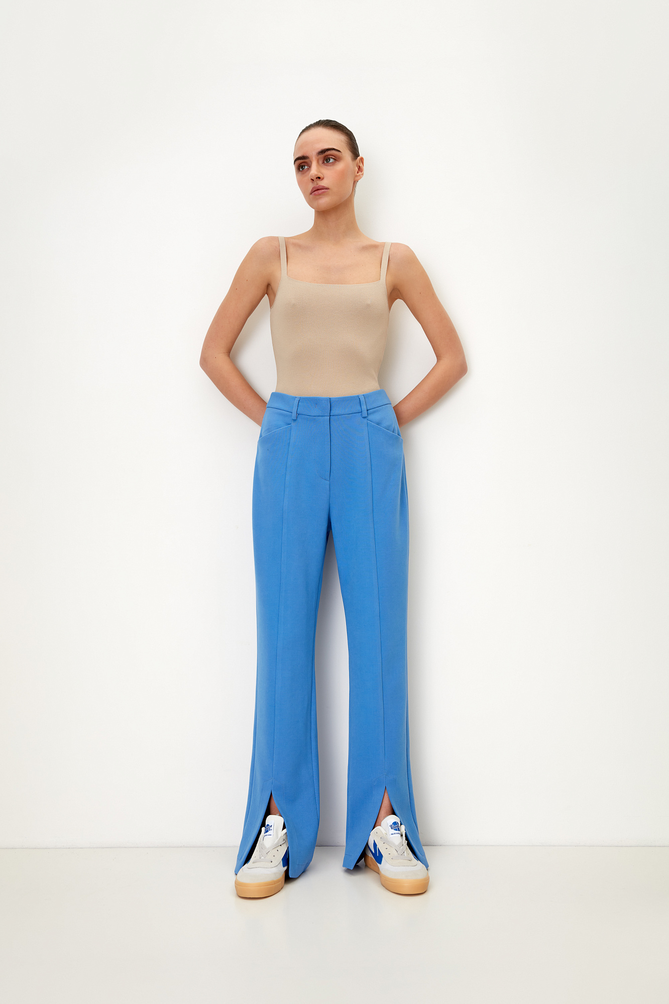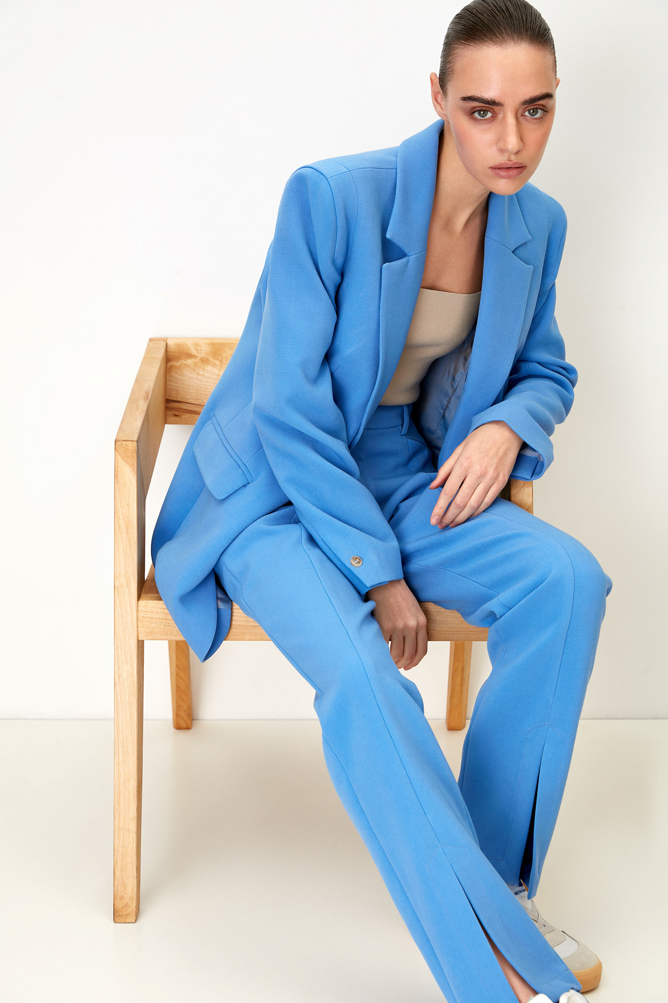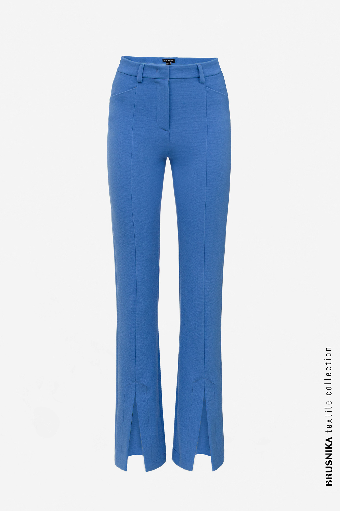 Классические прямые брюки с разрезами спереди. Боковые карманы и потойная застежка на молнию. Дополнить образ можно жакетом в таком же стиле.