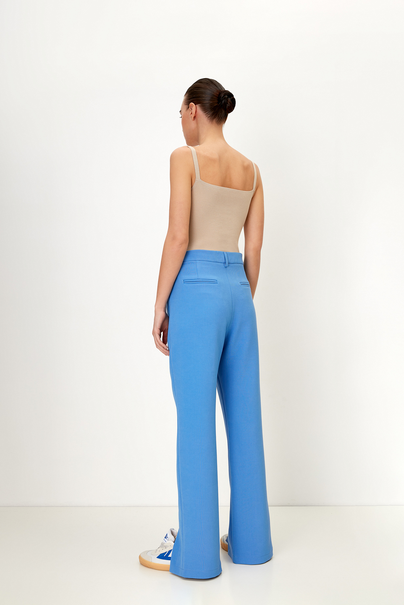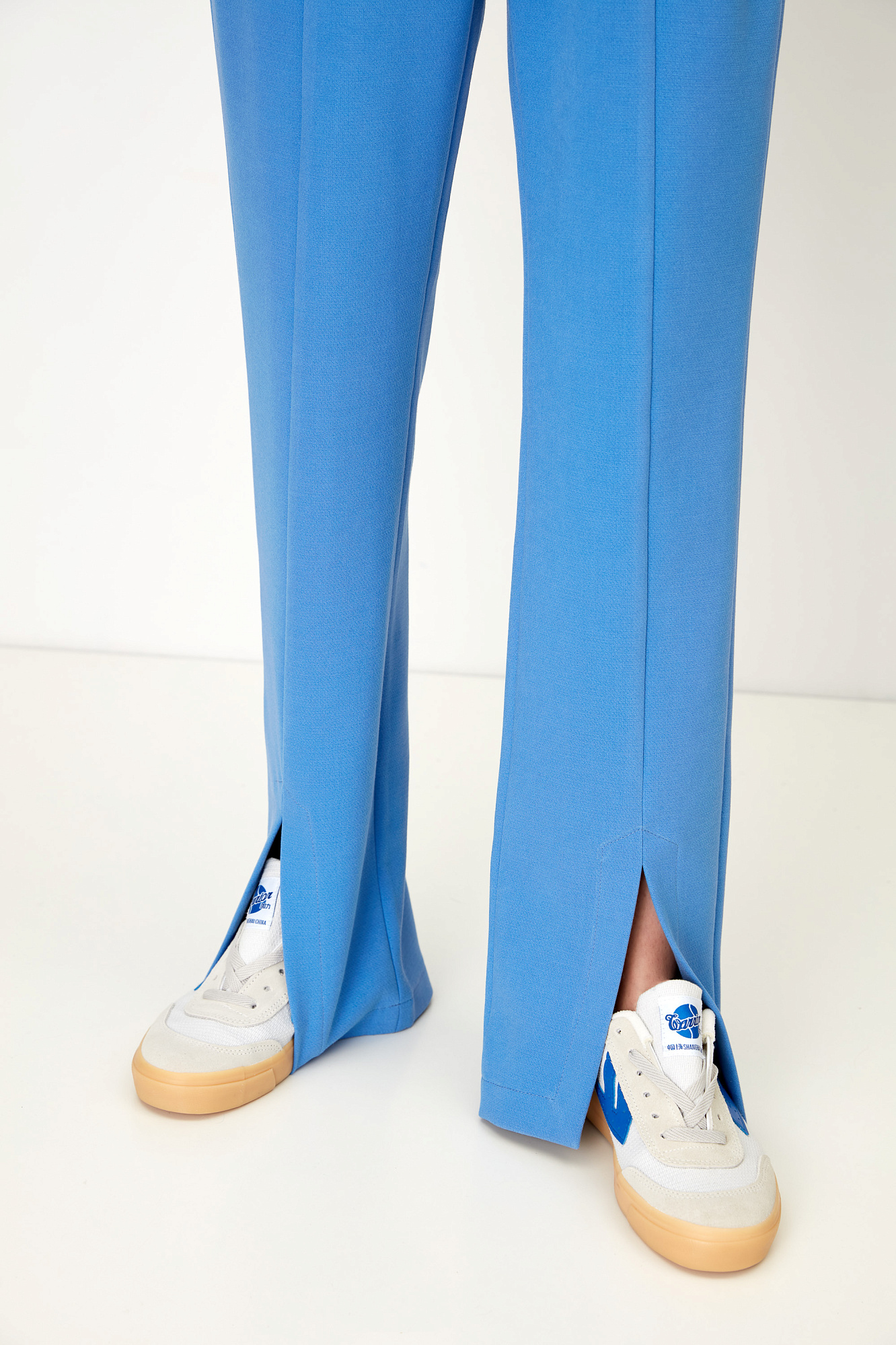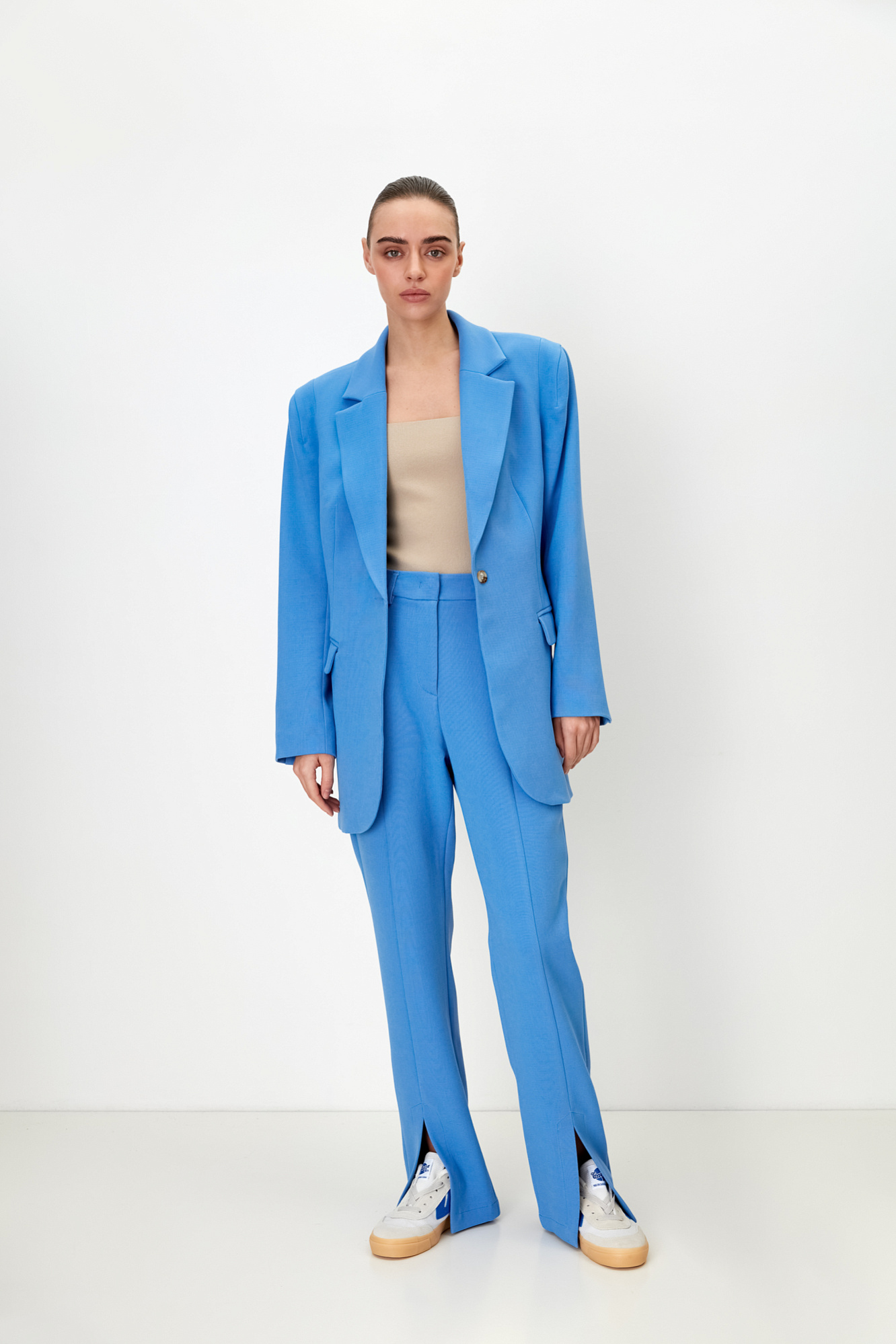 Классические прямые брюки с разрезами спереди. Боковые карманы и потойная застежка на молнию. Дополнить образ можно жакетом в таком же стиле.