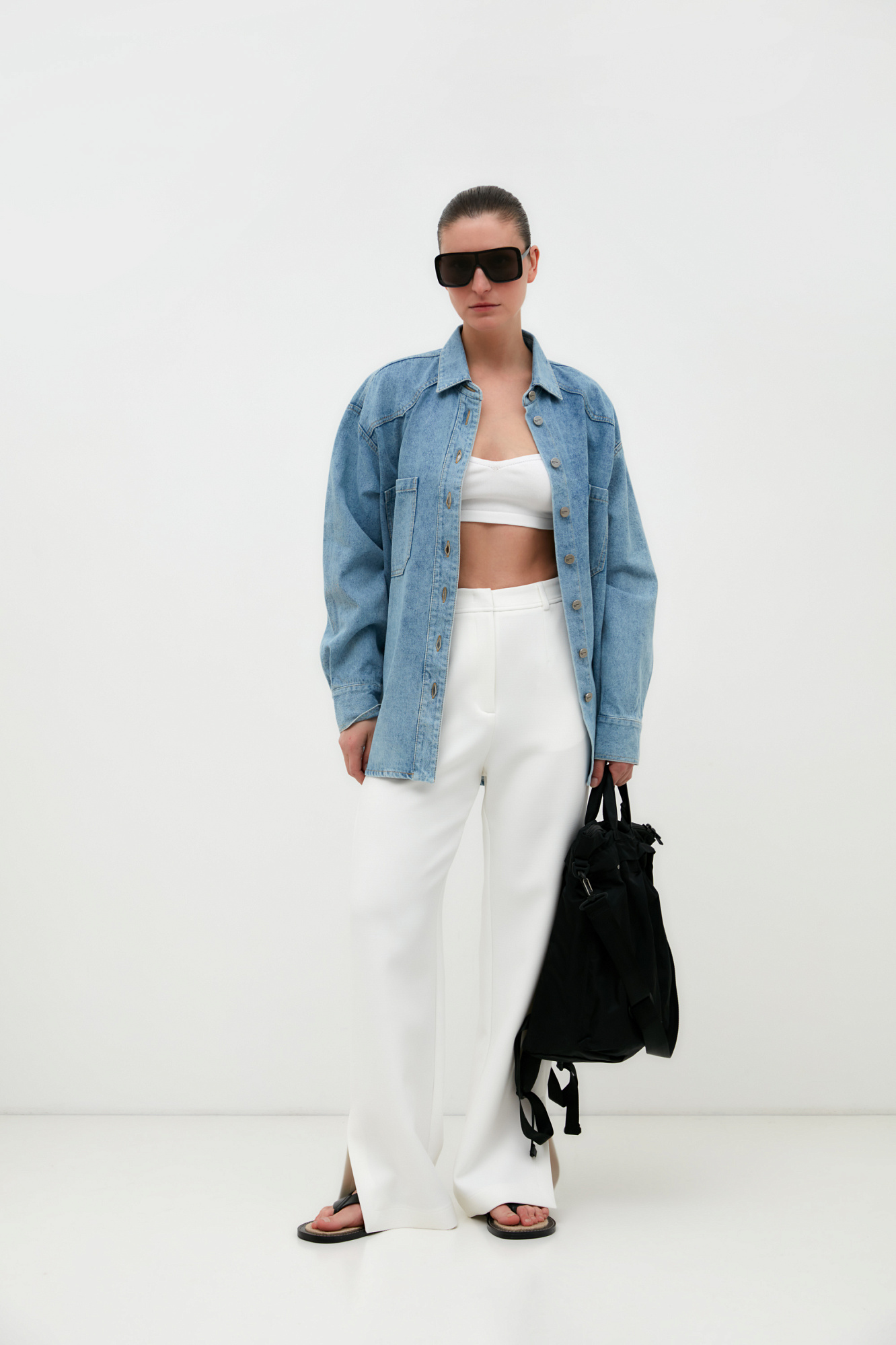 Классические брюки из поливискозы с разрезами по бокам. Модель со средней посадкой. Дополнить образ можно жакетом.