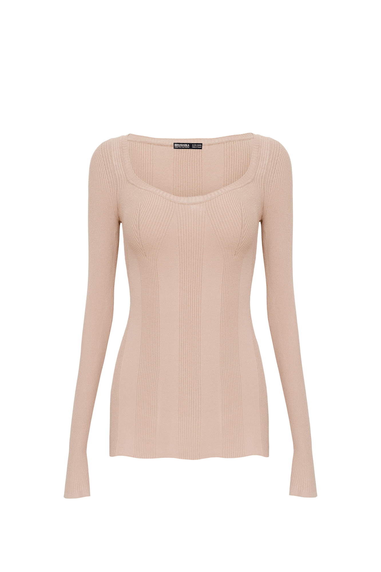 Трикотажный джемпер из поливискозы. Модель приталенного силуэта с квадратным вырезом на груди.