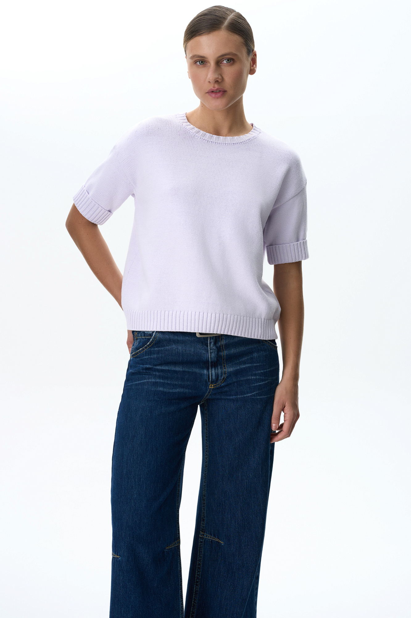 Трикотажная футболка из хлопка. Рукава с небольшим подворотом и низ изделия в рубчик.