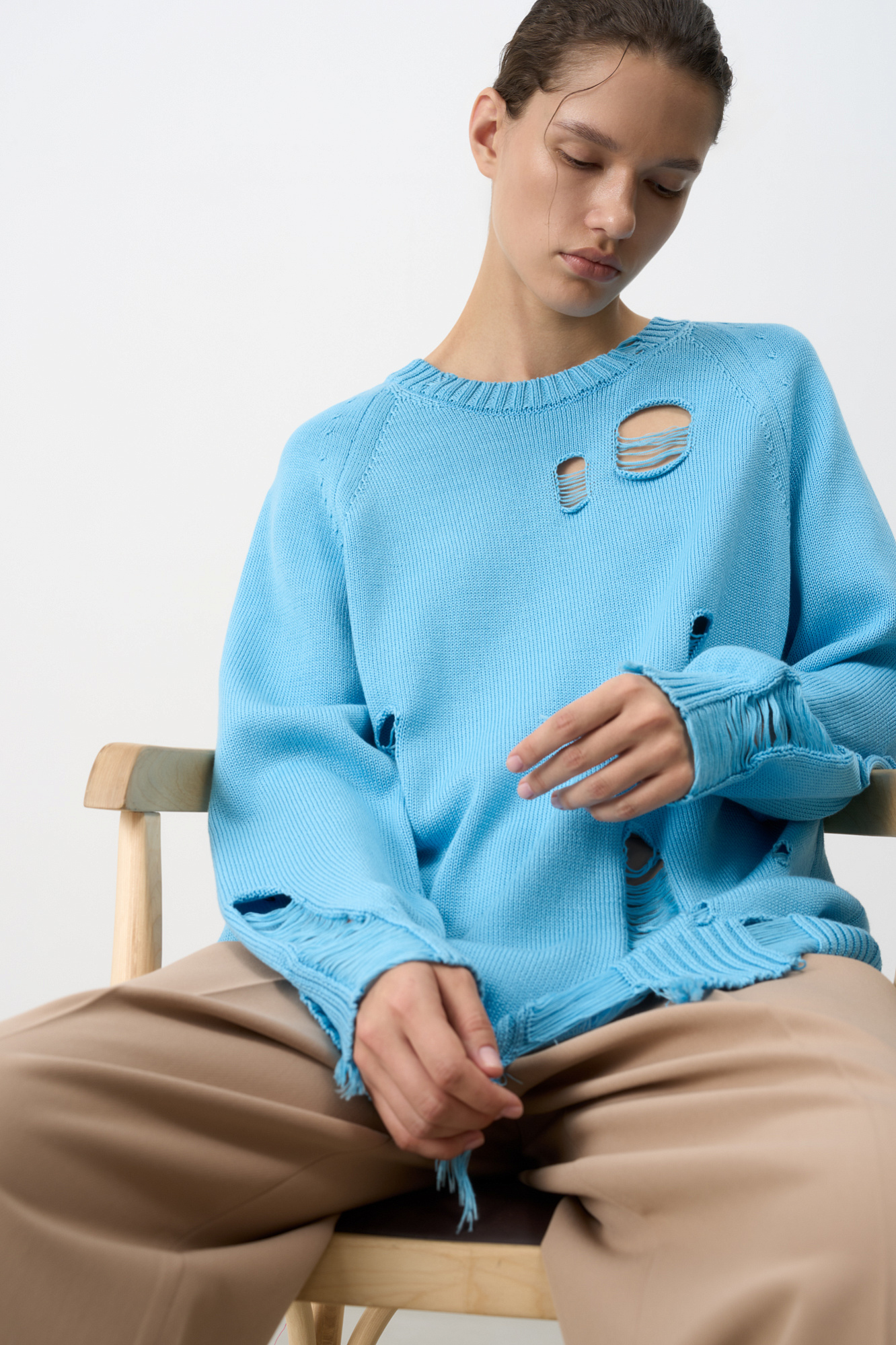 Джемпер из 100% хлопка с рукавами реглан и рваной текстурой.