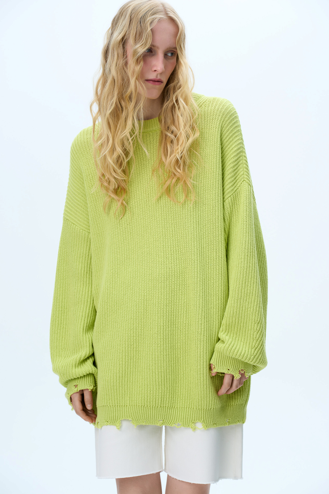 Трикотажный джемпер из 100% хлопка. Модель свободного силуэта со спущенной линией плеча и рваным нижним краем.