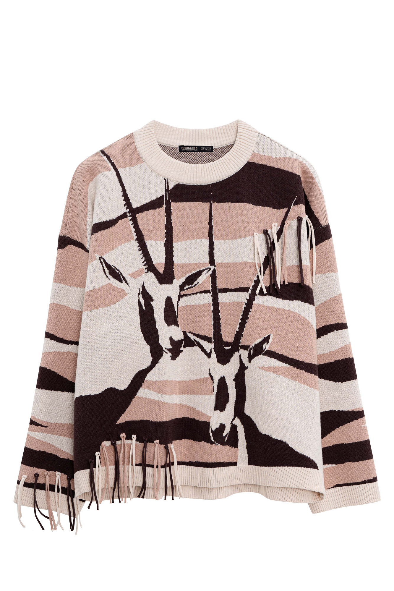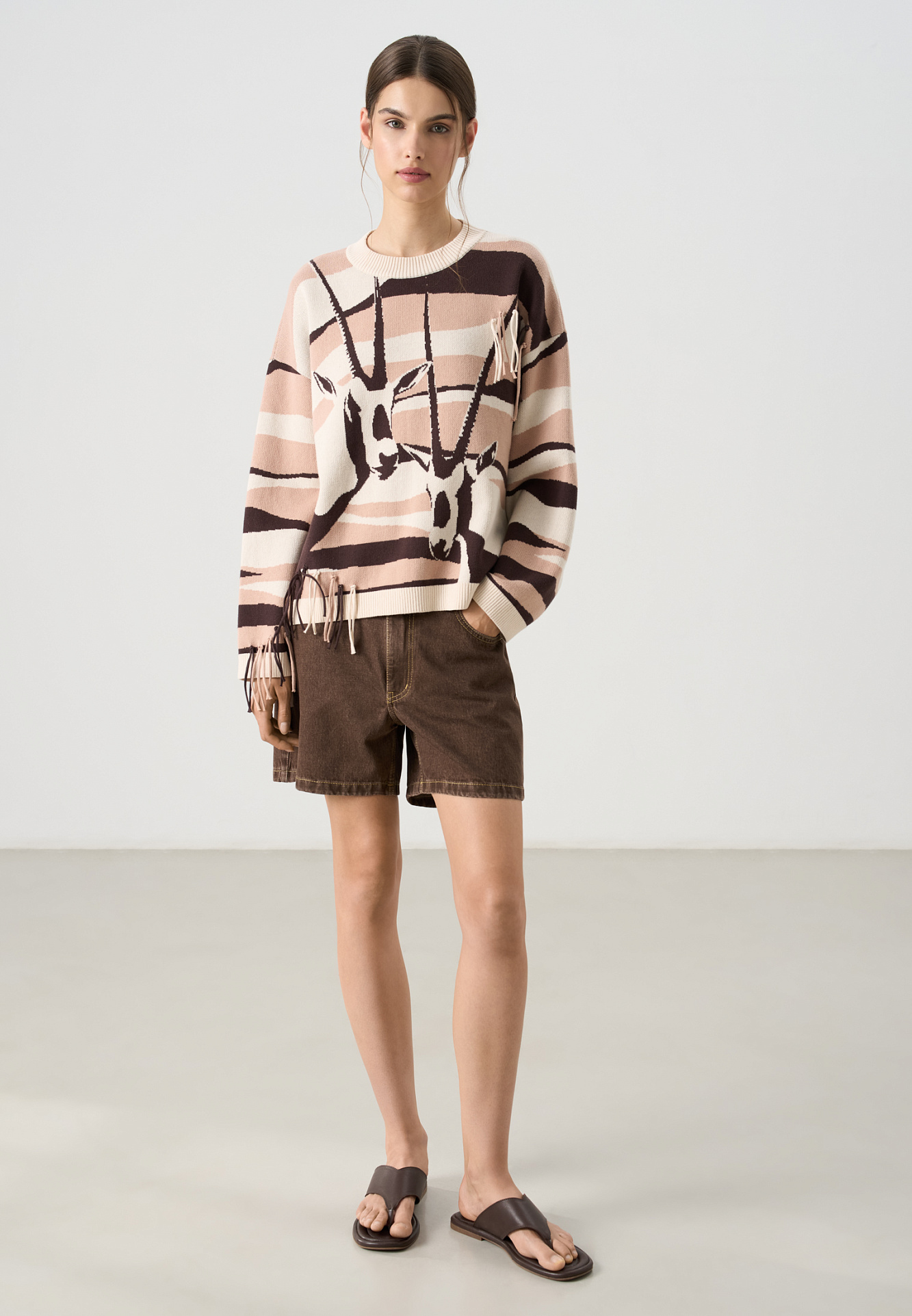Трикотажный джемпер из 100% хлопка с жаккардовым изображением антилопы орикса. Модель свободного силуэта, с длинными рукавами, спущенной линией плеч и круглым вырезом горловины. Изделие декорировано бахромой в тон джемпера. Края выполнены в рубчик.