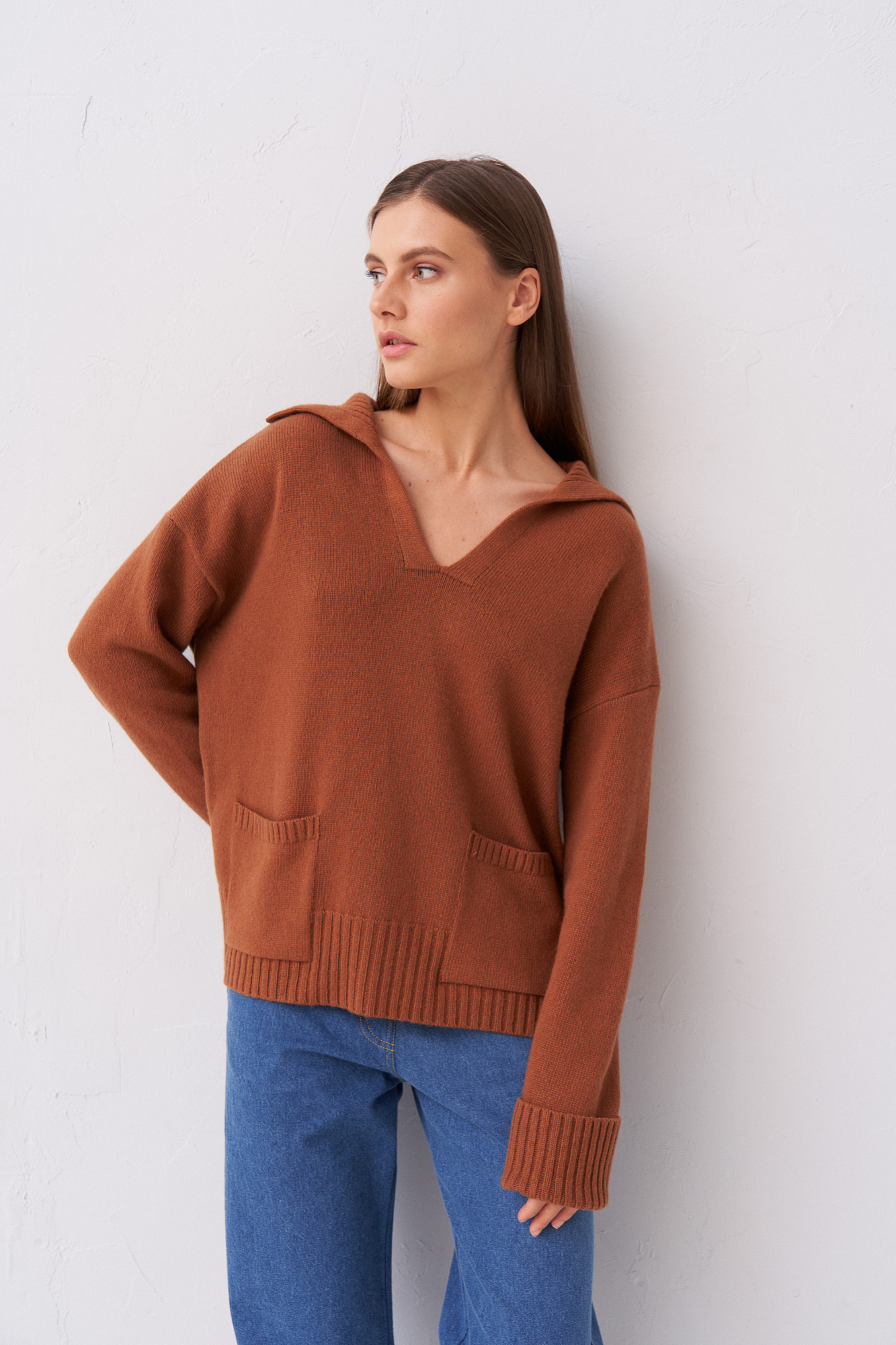 Трикотажный джемпер из шерсти с V-образным вырезом и отложным воротником. Модель свободного силуэта с накладными карманами.