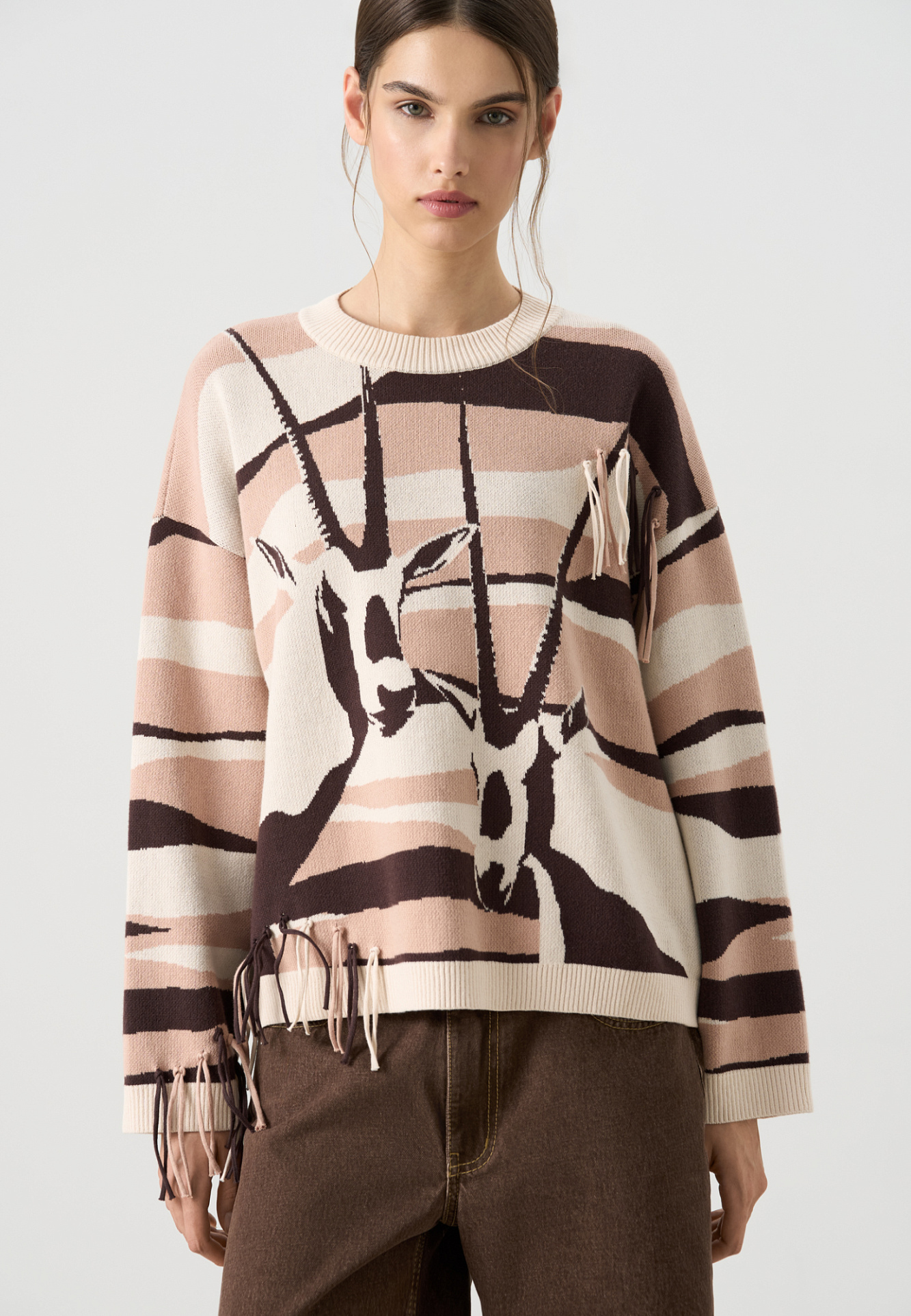 Трикотажный джемпер из 100% хлопка с жаккардовым изображением антилопы орикса. Модель свободного силуэта, с длинными рукавами, спущенной линией плеч и круглым вырезом горловины. Изделие декорировано бахромой в тон джемпера. Края выполнены в рубчик.