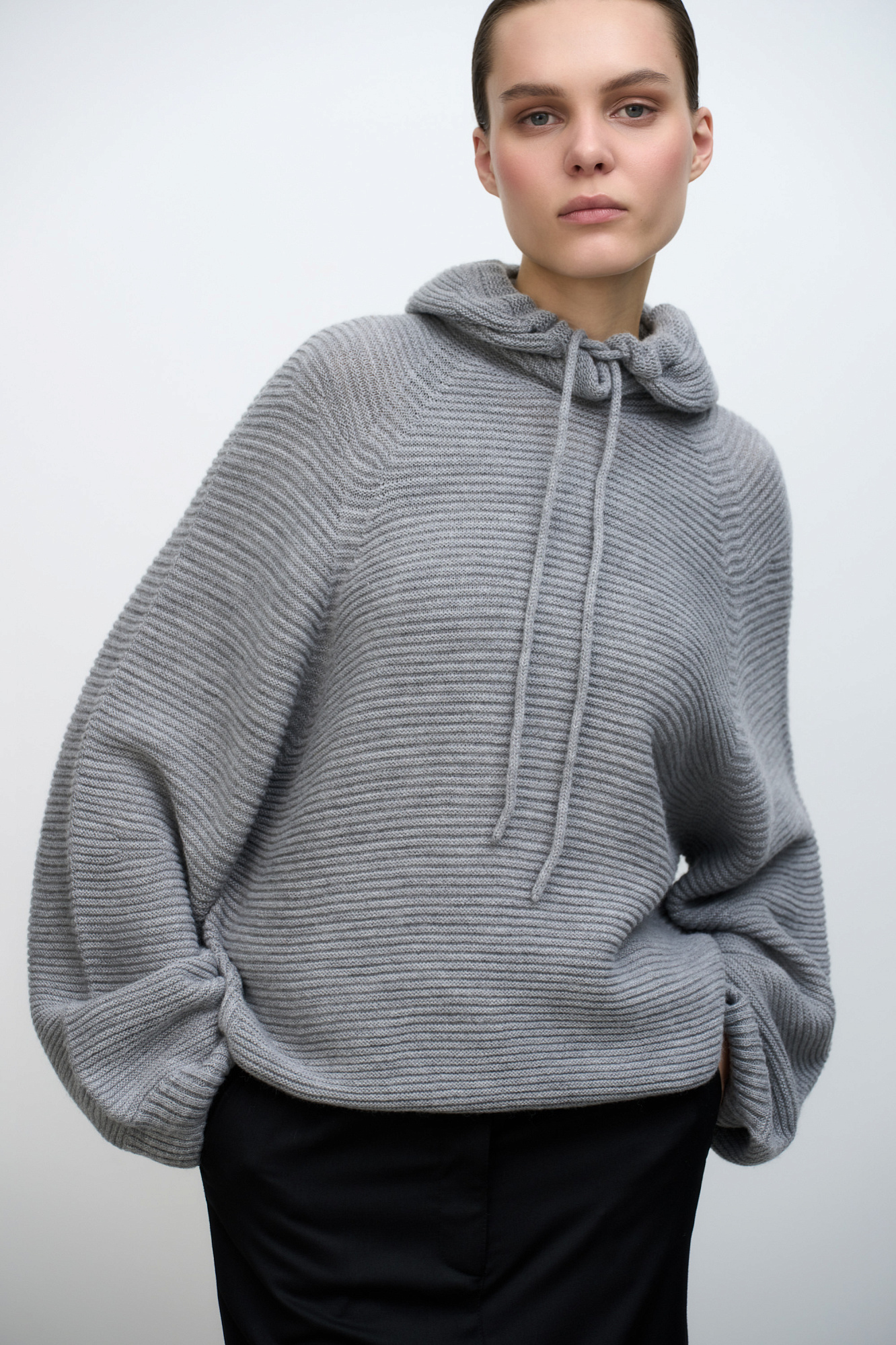 Трикотажное худи из смесовой шерсти. Модель свободного силуэта со спущенным плечом и капюшоном на кулиске. Края изделия в рубчик.