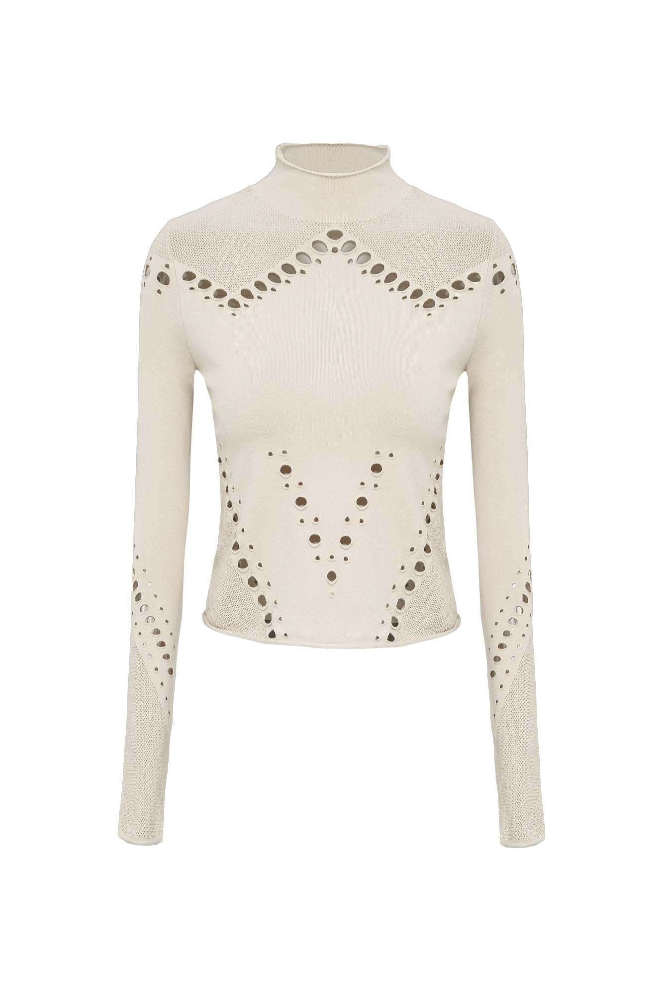 Трикотажная укороченная водолазка из тонкой эластичной вискозы. Модель облегающего силуэта, с длинными рукавами и невысоким воротником-стойкой. Изделие выполнено в комбинированной технике вязки, сочетающей гладь и сетку. Водолазка декорирована вырезами, создающими геометрический узор.