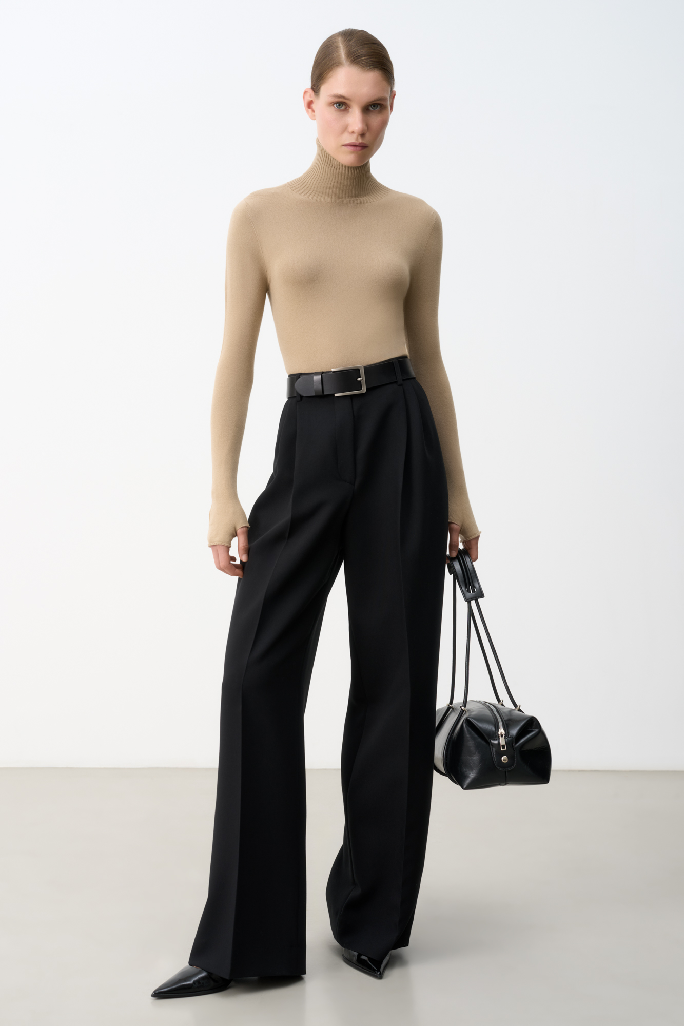Классическая водолазка из вискозы облегающего силуэта с высоким воротом под горло. Удлиненные рукава-митенки.