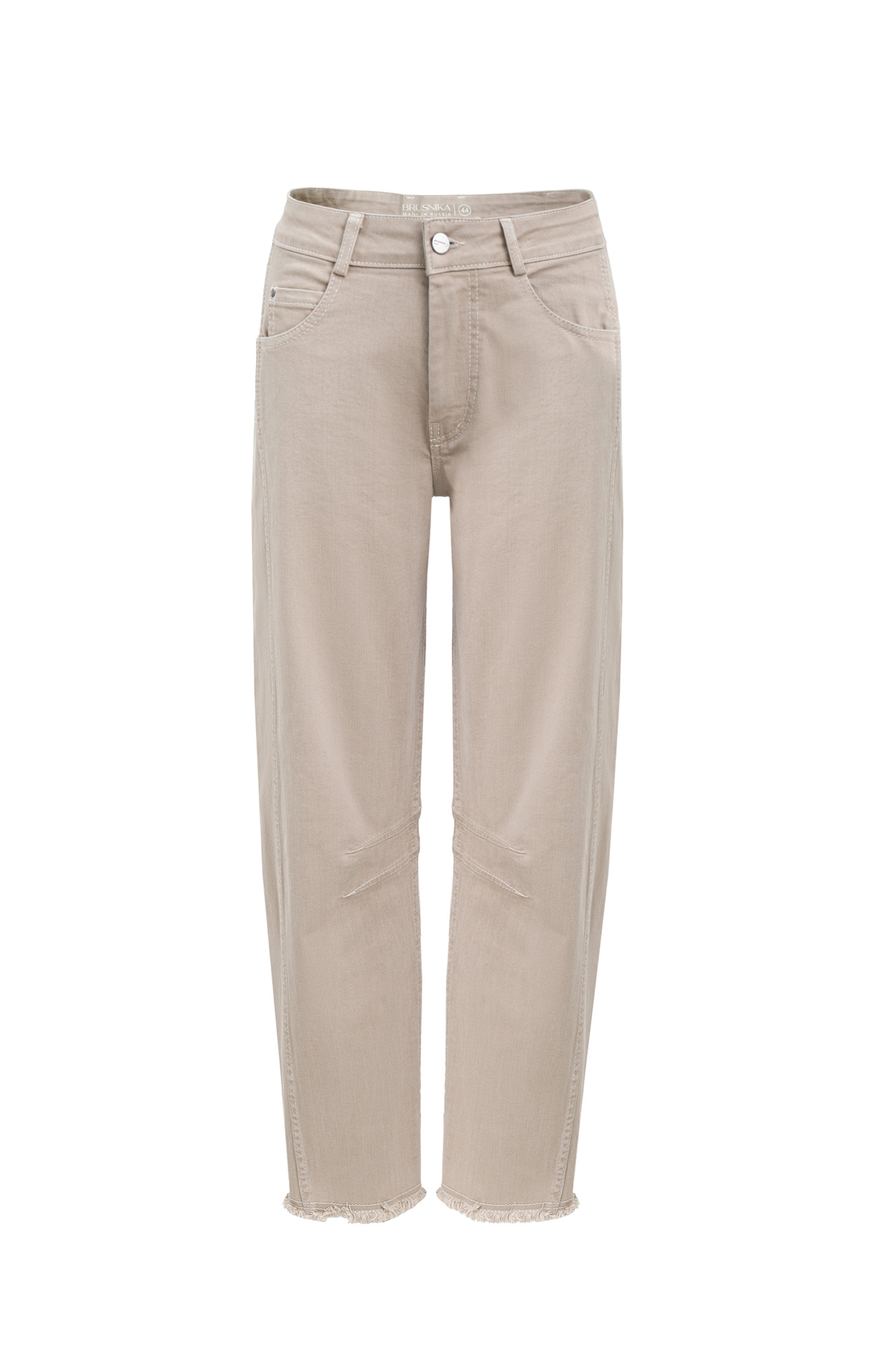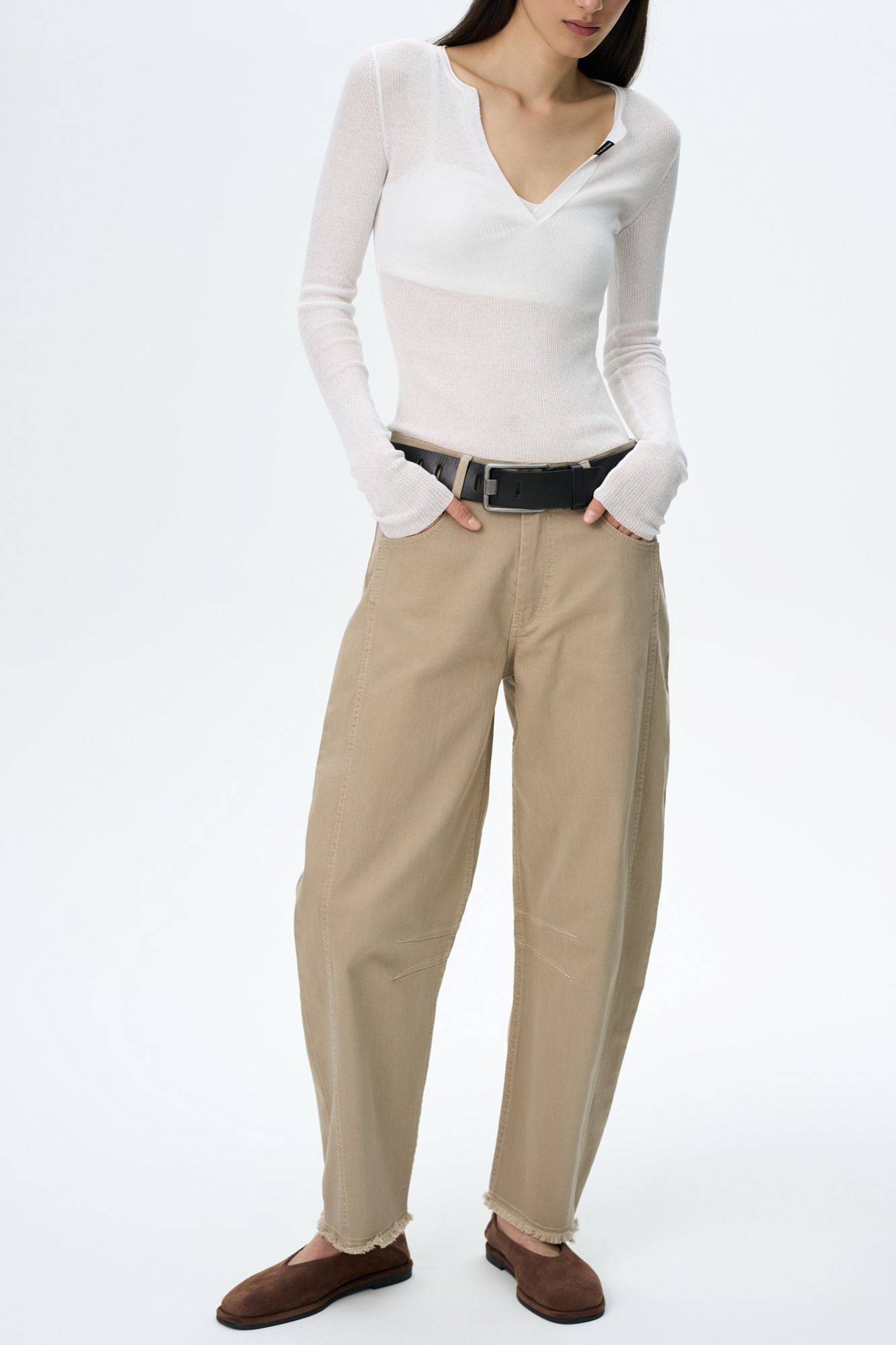 Прямые джинсы с вытачками и необработанным низом. Модель со средней посадкой, дополнена шлевками для ремня. Пять карманов. Застежка на потайную молнию и пуговицу. Дополнить образ можно жилетом в таком же стиле.