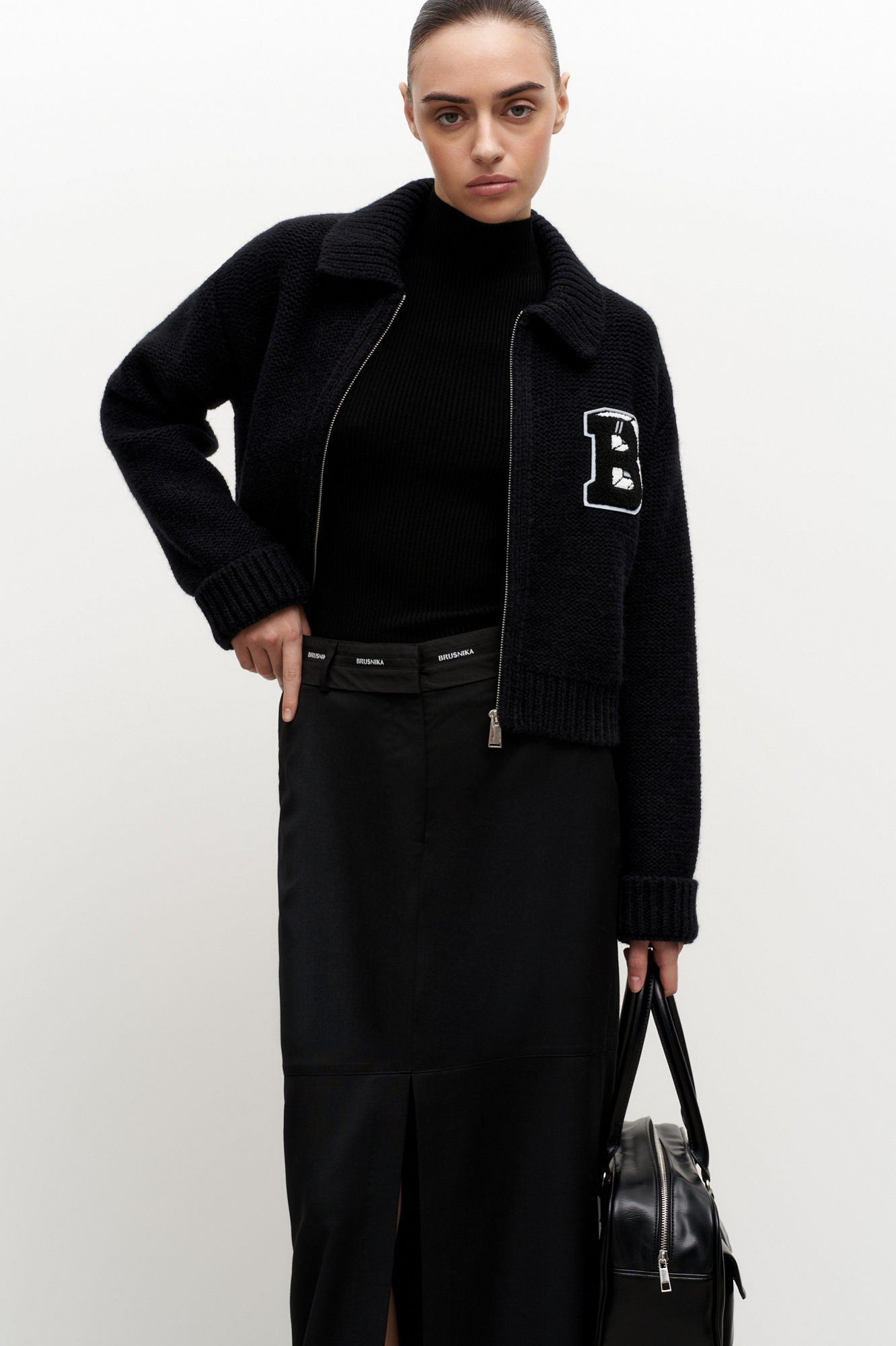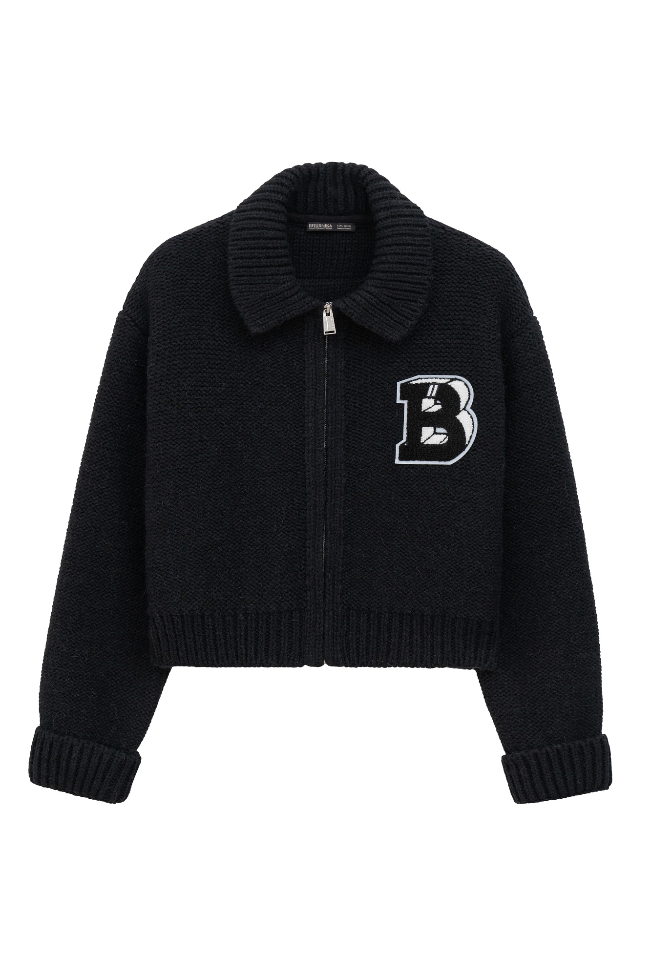 Трикотажный бомбер из шерсти альпака. Модель свободного силуэта со спущенным плечом и жаккардовым узором в виде буквы "B". Края изделия в рубчик.
