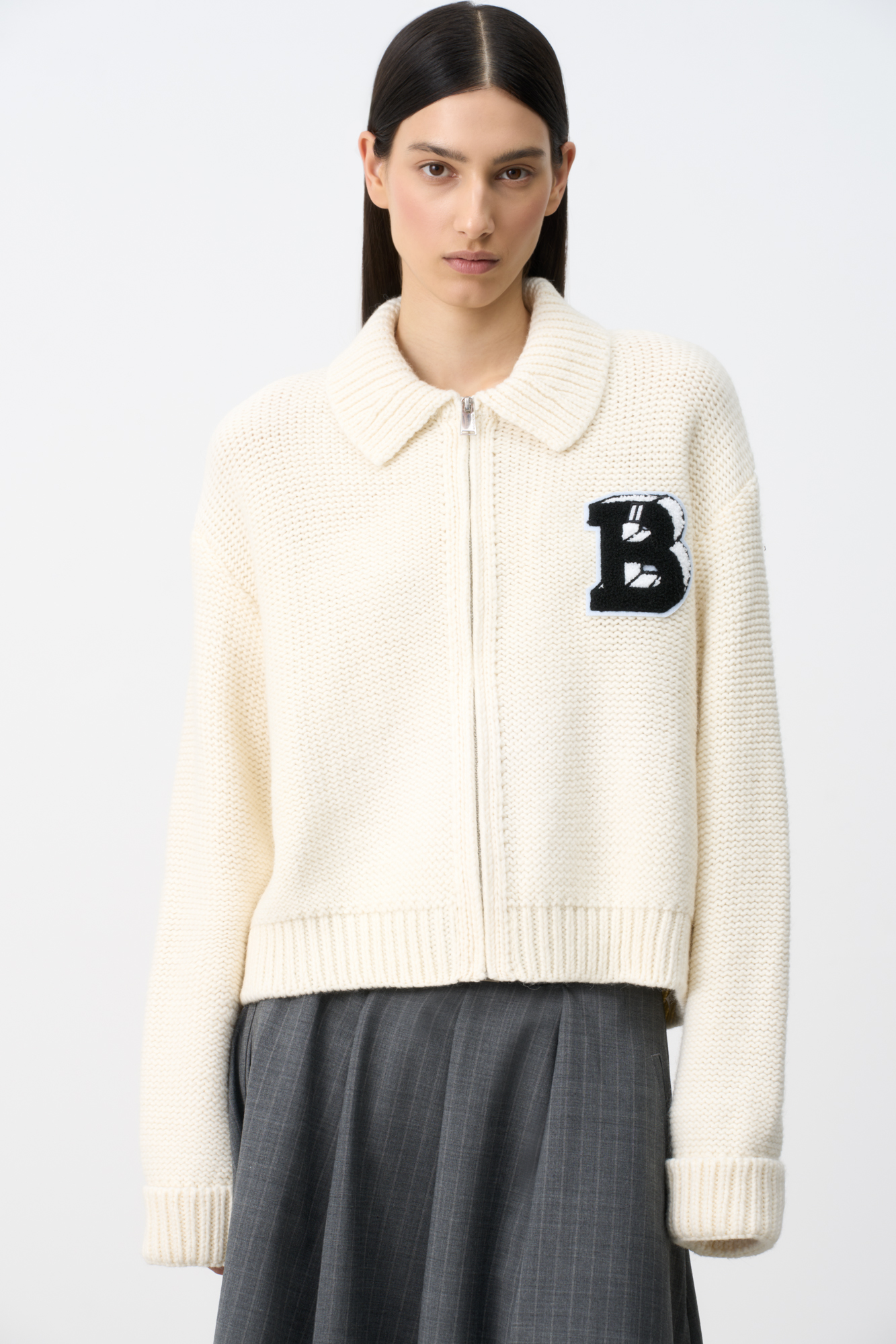 Трикотажный бомбер из шерсти альпака. Модель свободного силуэта со спущенным плечом и жаккардовым узором в виде буквы "B". Края изделия в рубчик.
