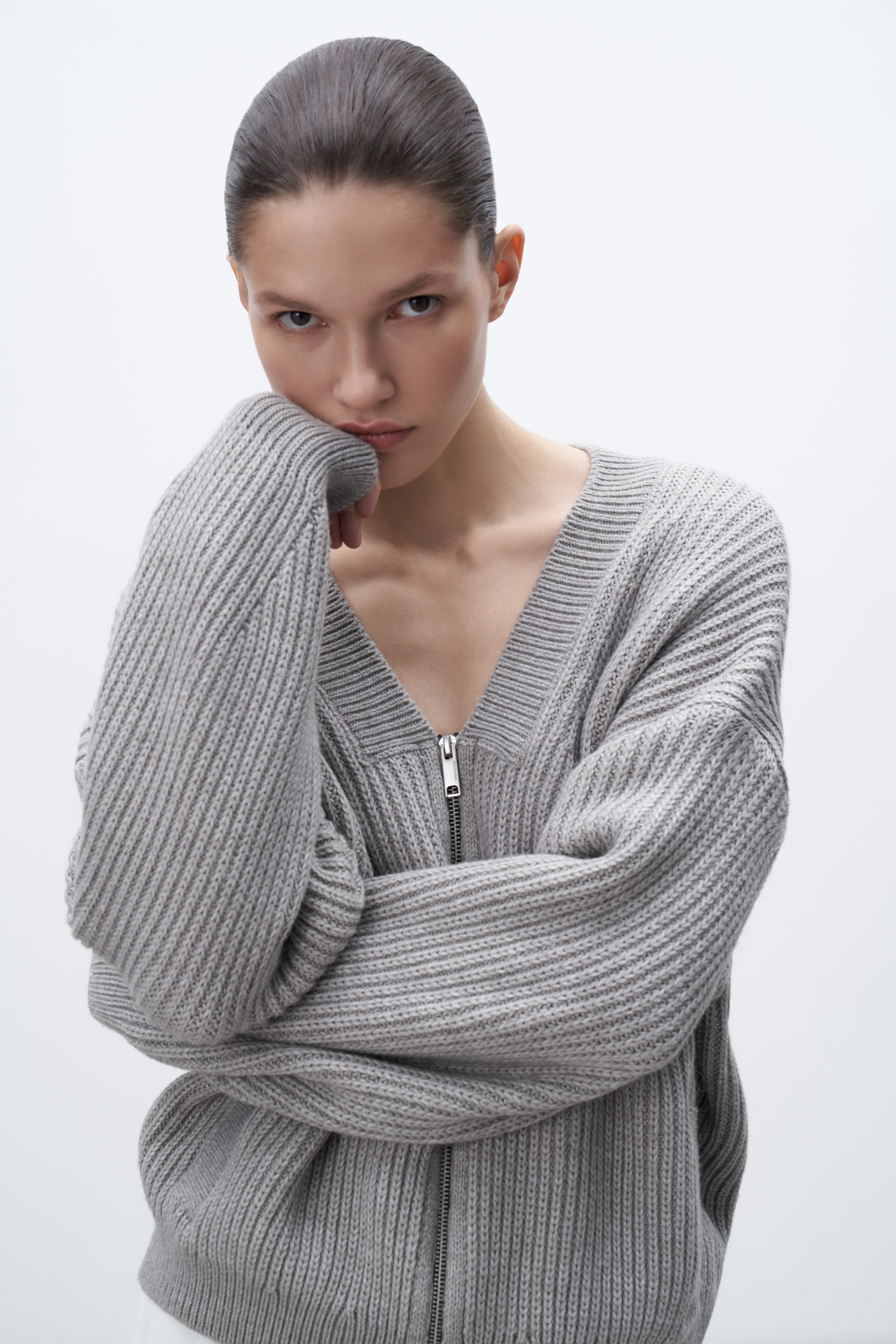 Трикотажный бомбер с боковыми карманами. Модель свободного силуэта со спущенной линией плеча и застежкой на молнию.