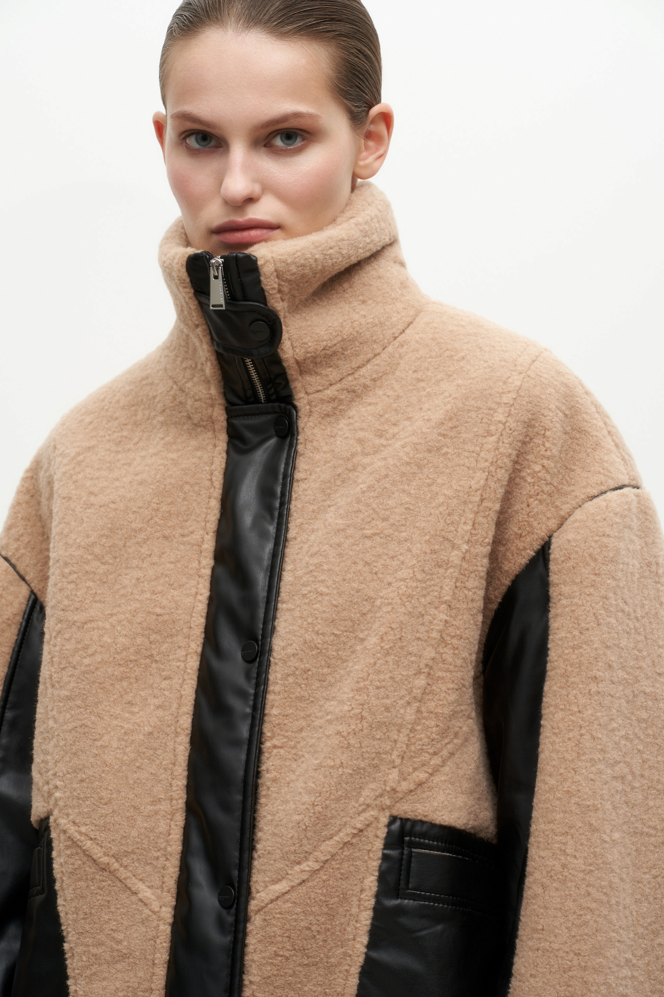 Утепленная куртка из экомеха. Модель свободного силуэта, декорированная вставками из экокожи и брендированным ярлыком на спине. Воротник-стойка, боковые карманы, застежка на молнию и кнопки. Манжеты и низ изделия на резинке. На подкладке.
