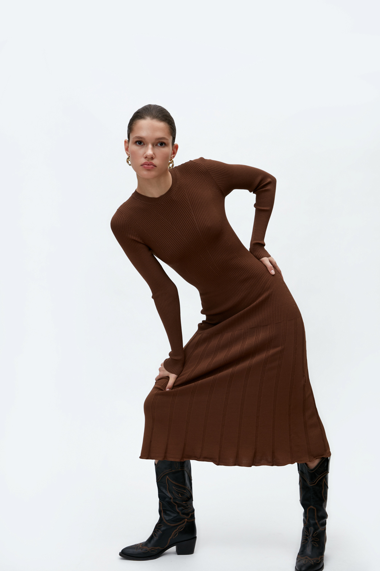 Цельновязаное платье с расклешенной юбкой. Модель приталенного силуэта длины миди.