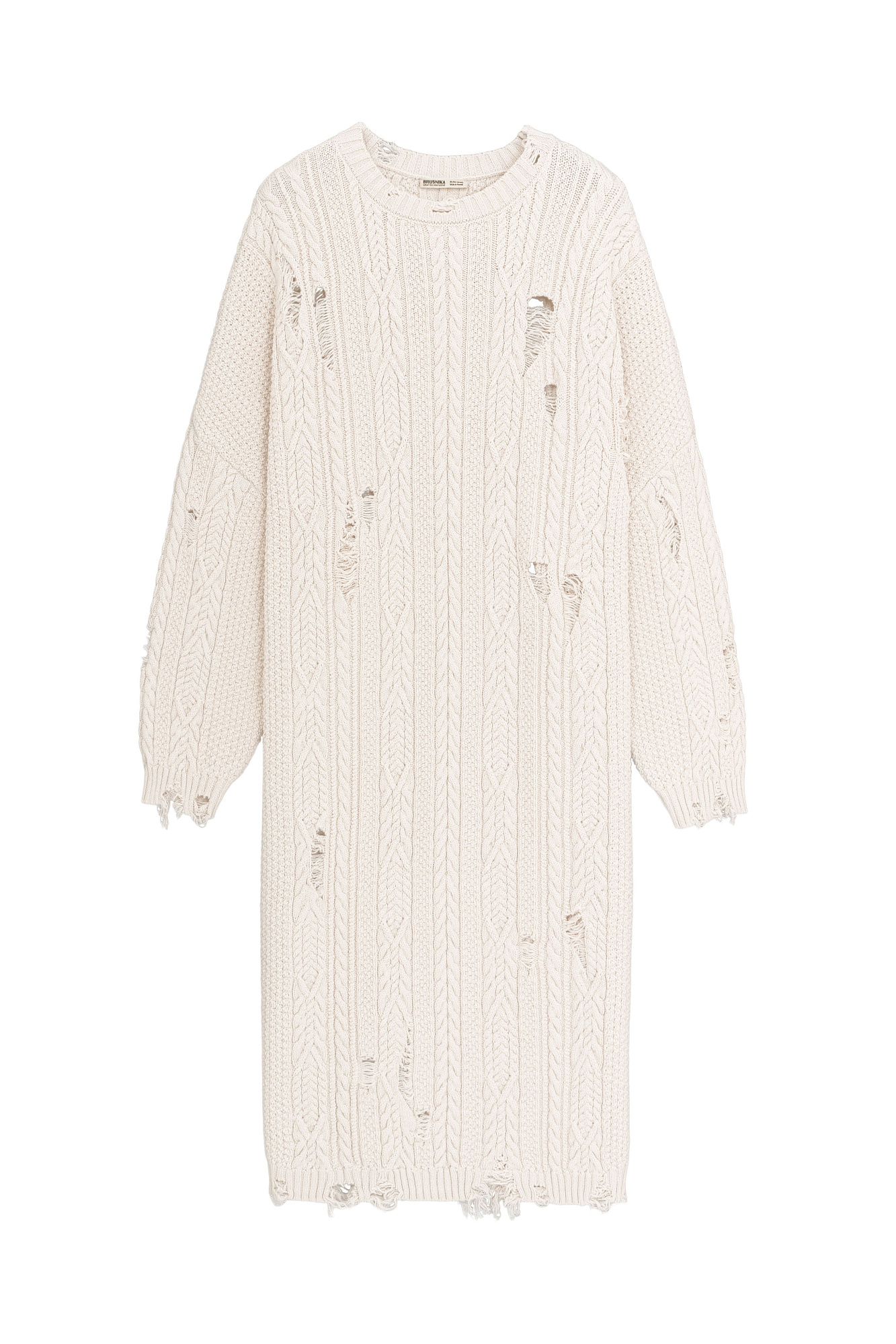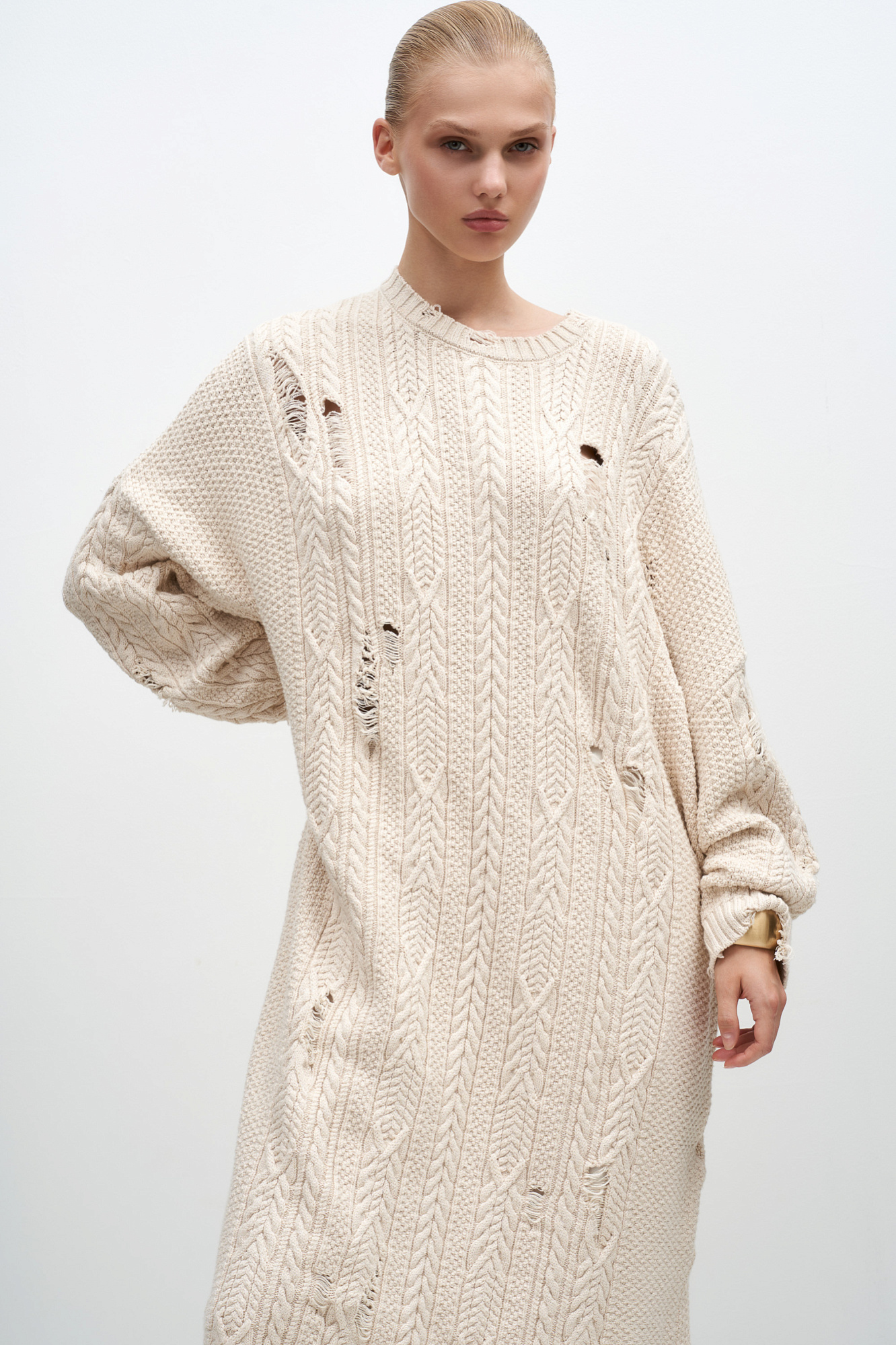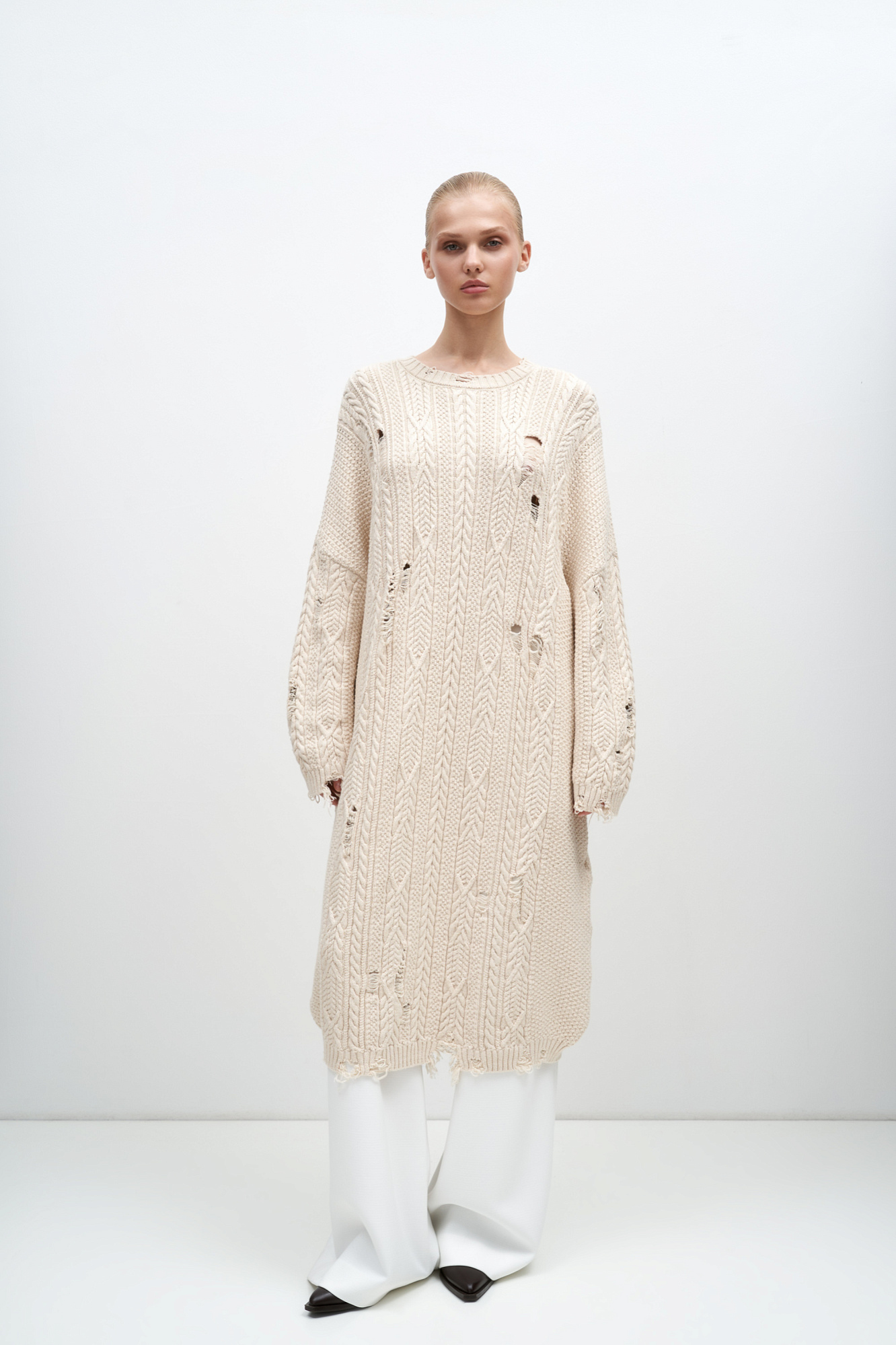 Трикотажное платье с разрезами в стиле гранж. Модель свободного силуэта длины миди, со спущенным плечом и круглым вырезом.