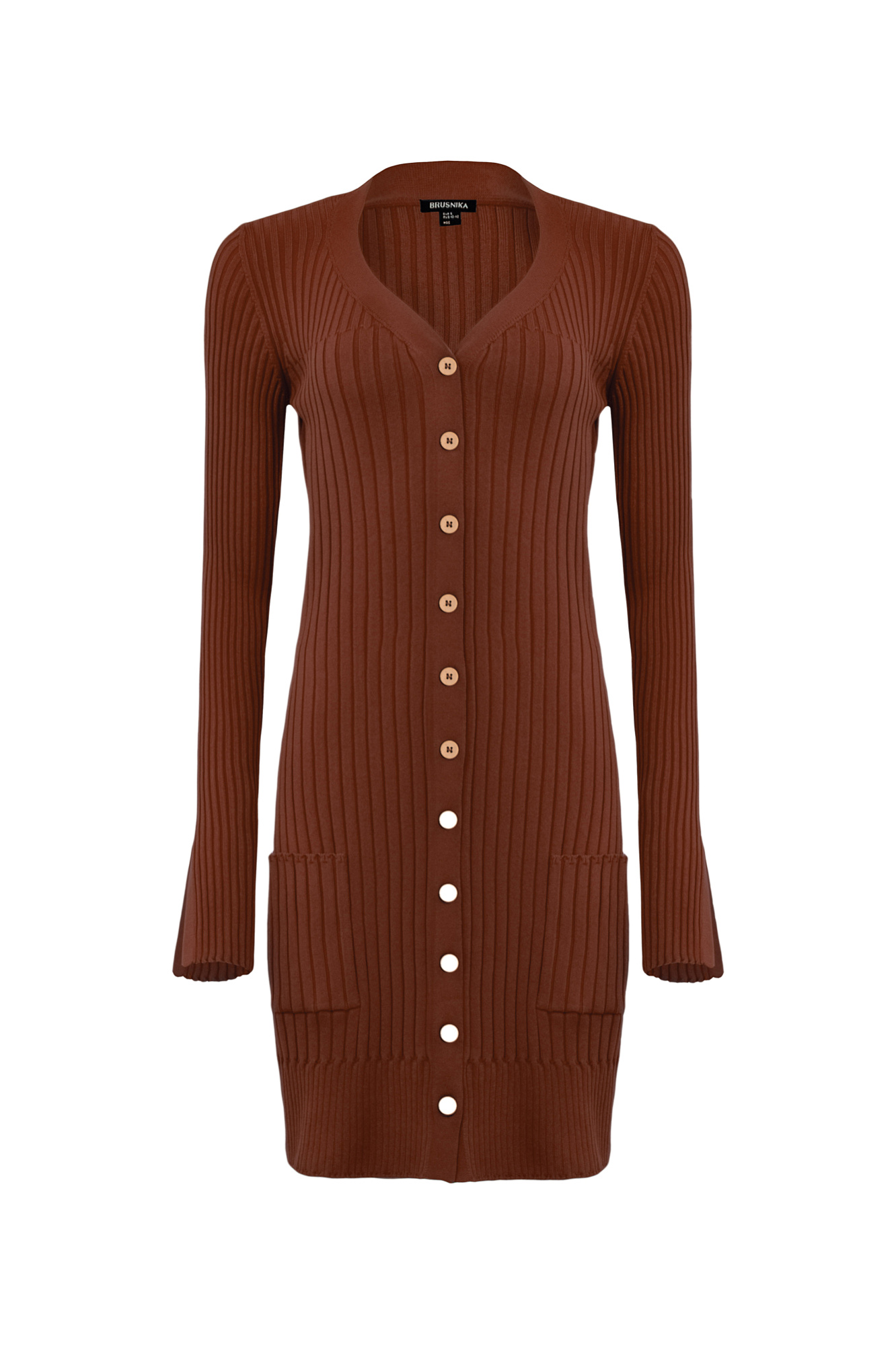 Платье-кардиган на пуговицах, с накладными карманами и разрезами на манжетах.