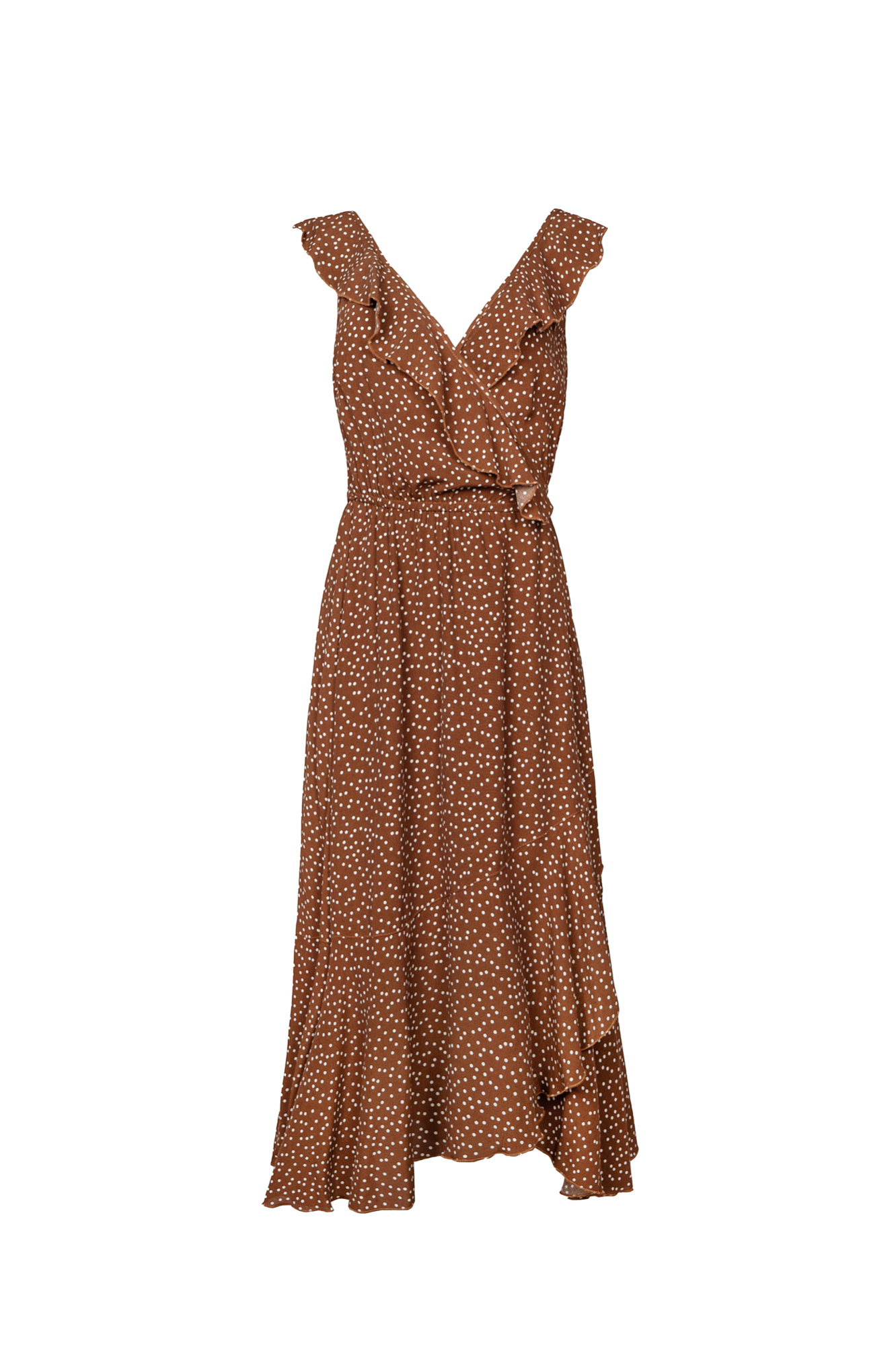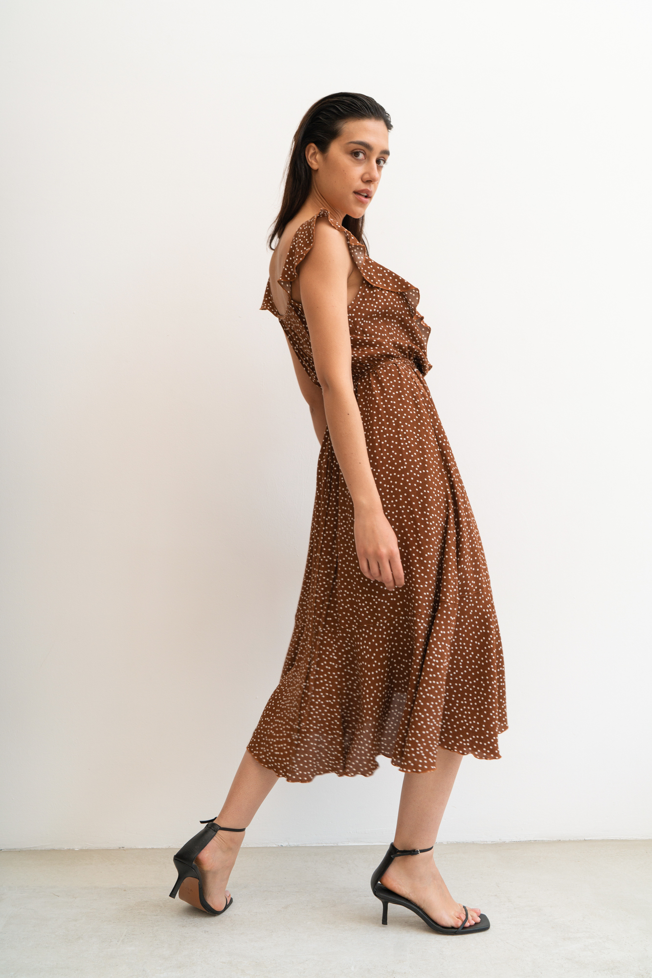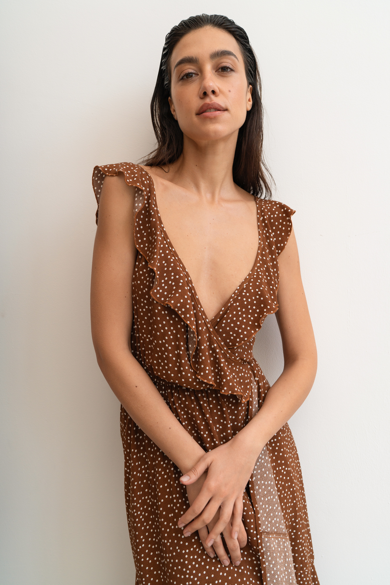 Сарафан в мелкий горох из 100% вискозы на запах, с V-образным вырезом и асимметричным низом.