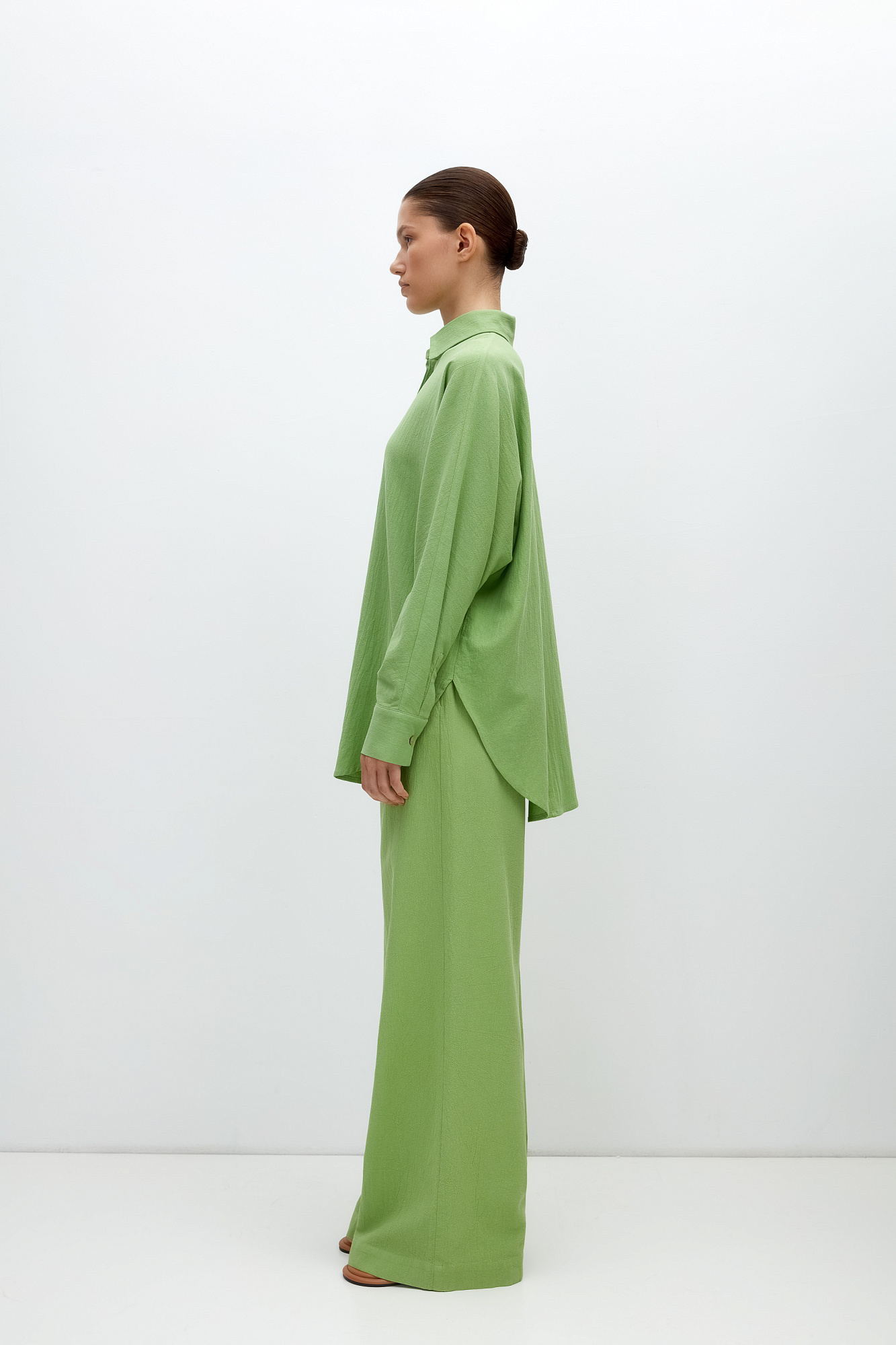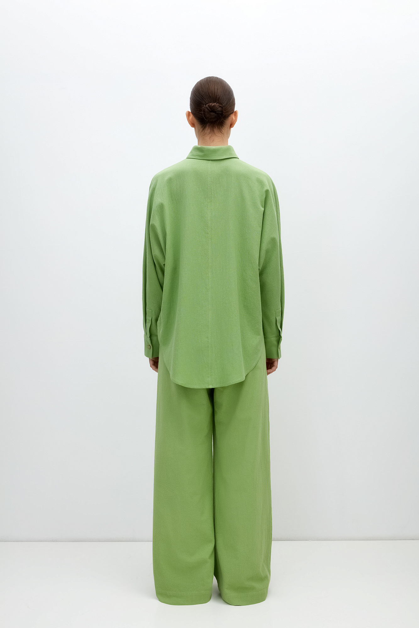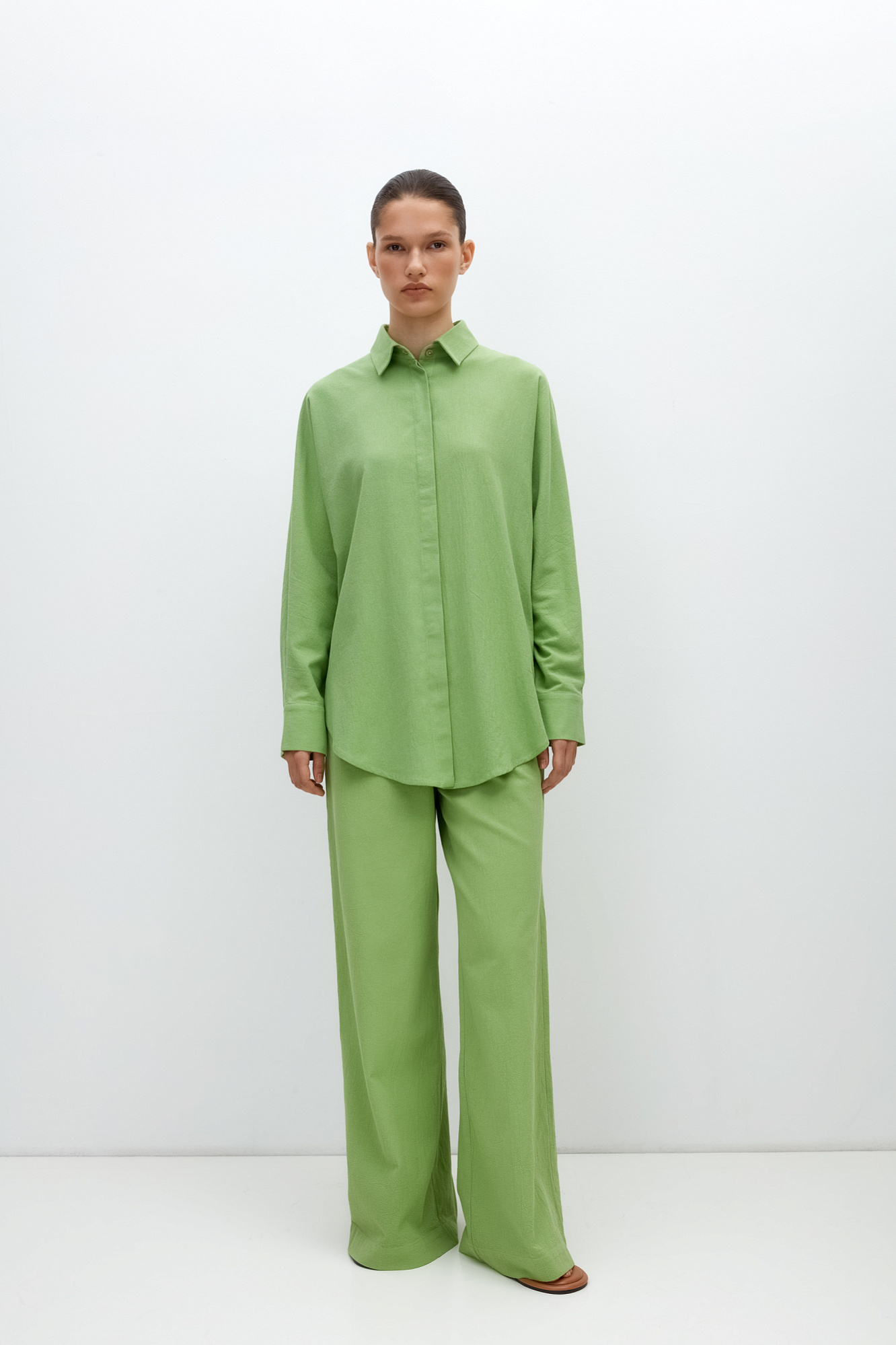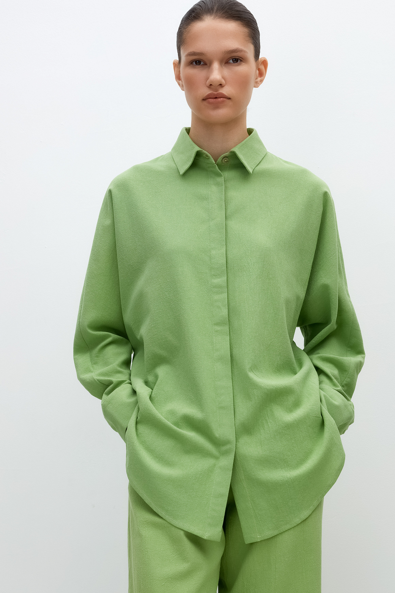 Классическая рубашка из 100% хлопка с потайной застежкой на пуговицы. Дополнить образ можно брюками.