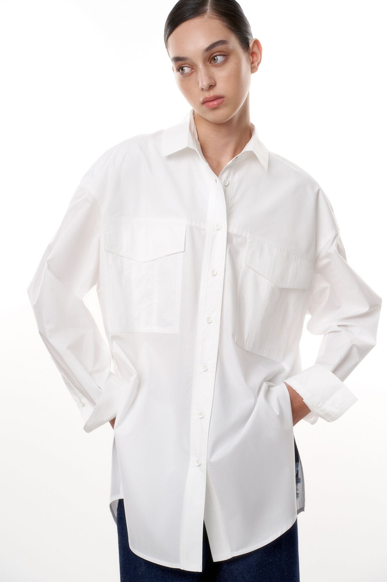 Классическая рубашка из 100% хлопка со спущенным рукавом и накладными карманами. Модель прямого силуэта с застежкой на пуговицы.