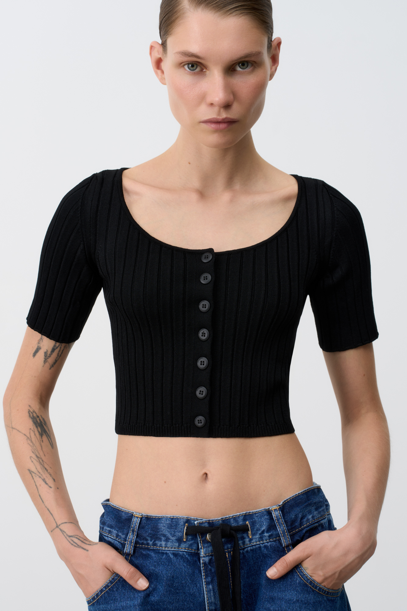 Укороченный кроп-топ на пуговицах из вискозы, выполнен из мягкой пряжи в рубчик, с коротким рукавом.