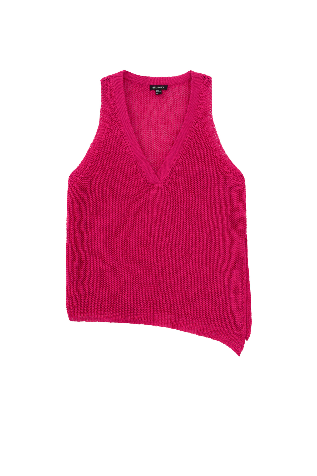 Трикотажный топ из 100% льна с V-образным вырезом. Модель асимметричного силуэта с глубокой проймой.