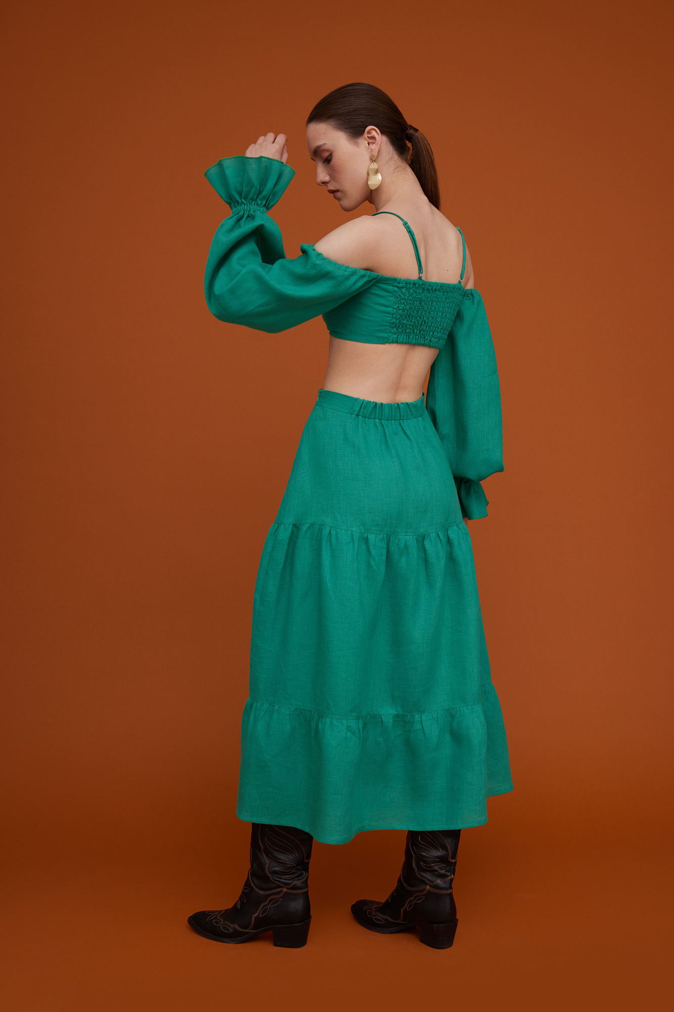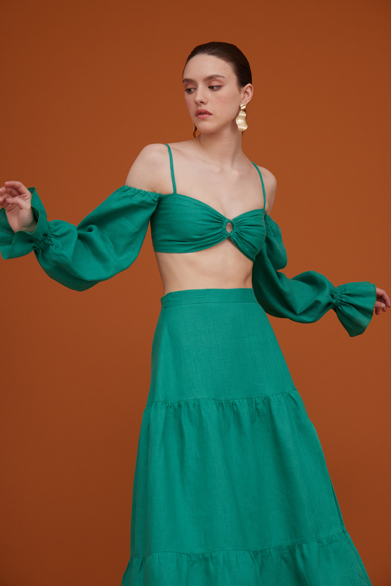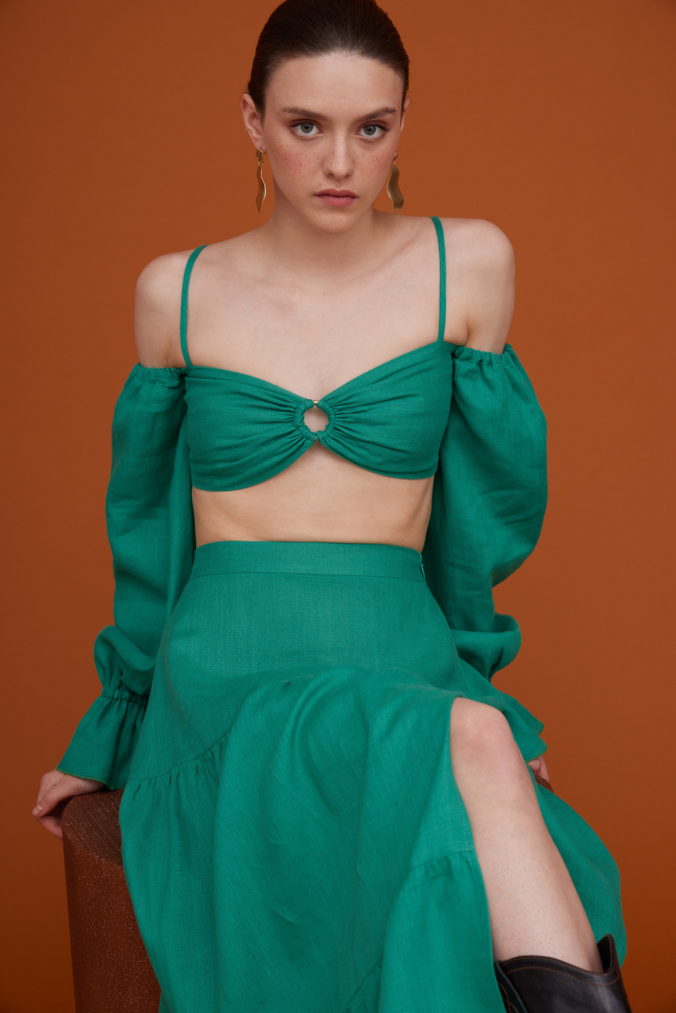 Короткий топ из 100% льна на тонких бретелях. Длинные рукава-фонарики.