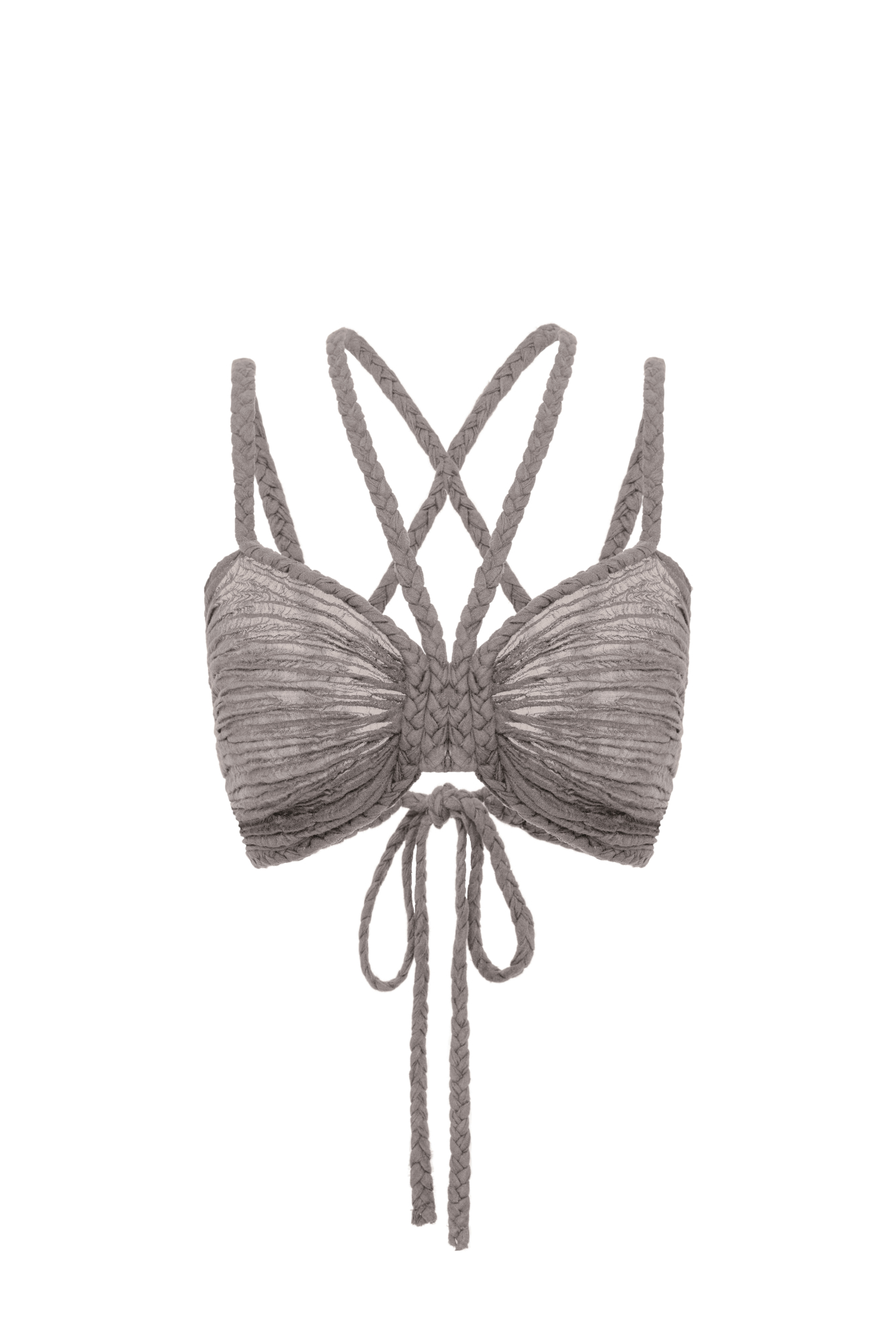 Полупрозрачный кроп-топ изо льна. Модель сложного кроя с драпировкой на лифе и завязками-косами.