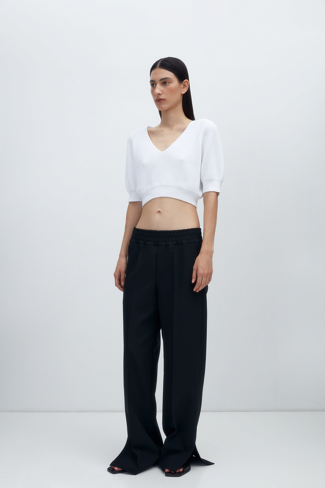 Трикотажный топ из хлопка с V-образным вырезом и коротким рукавом. Манжеты и низ изделия в рубчик.