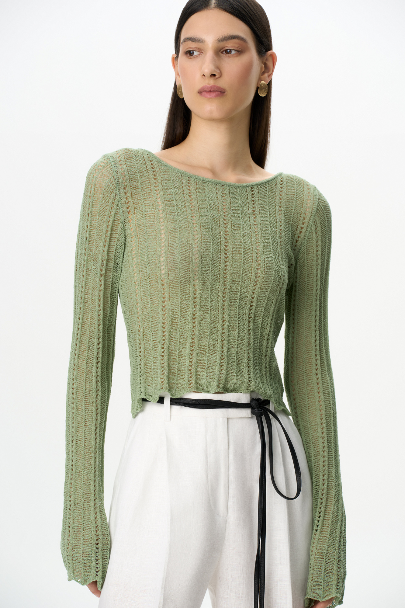 Трикотажный укороченный топ с длинным рукавом. Модель выполнена ажурным переплетением.